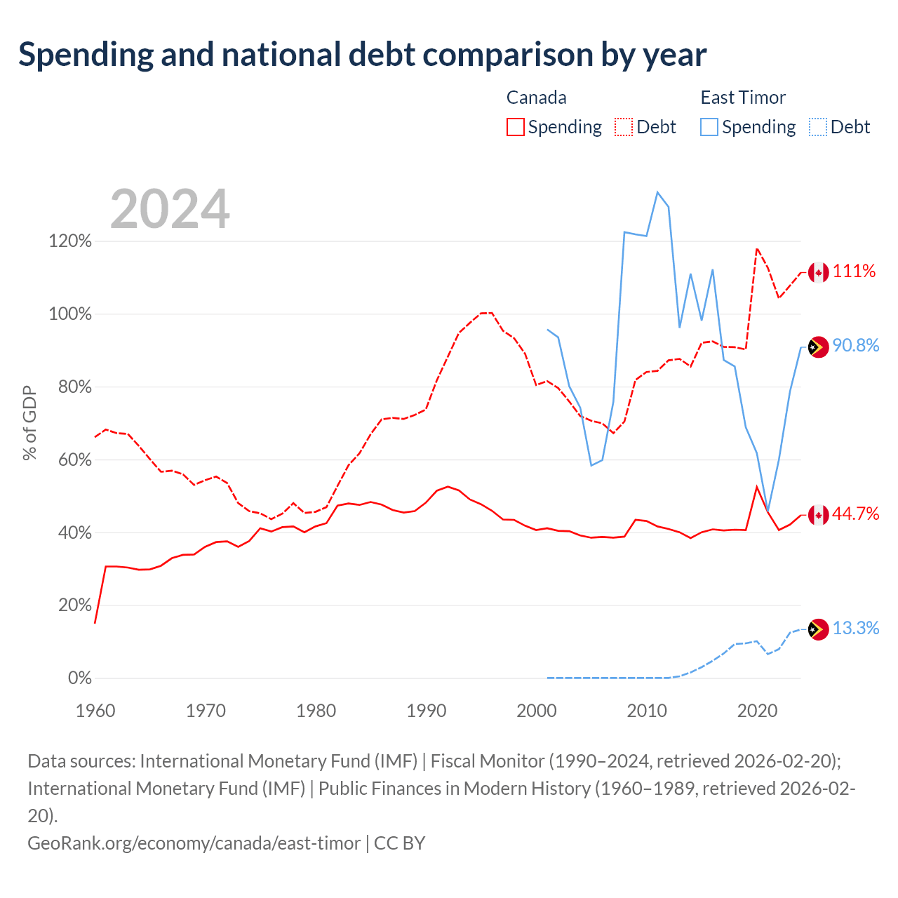 Canada has $2.5T in government debt (111.3% of GDP), compared to $249M (13.3% of GDP) in East Timor.