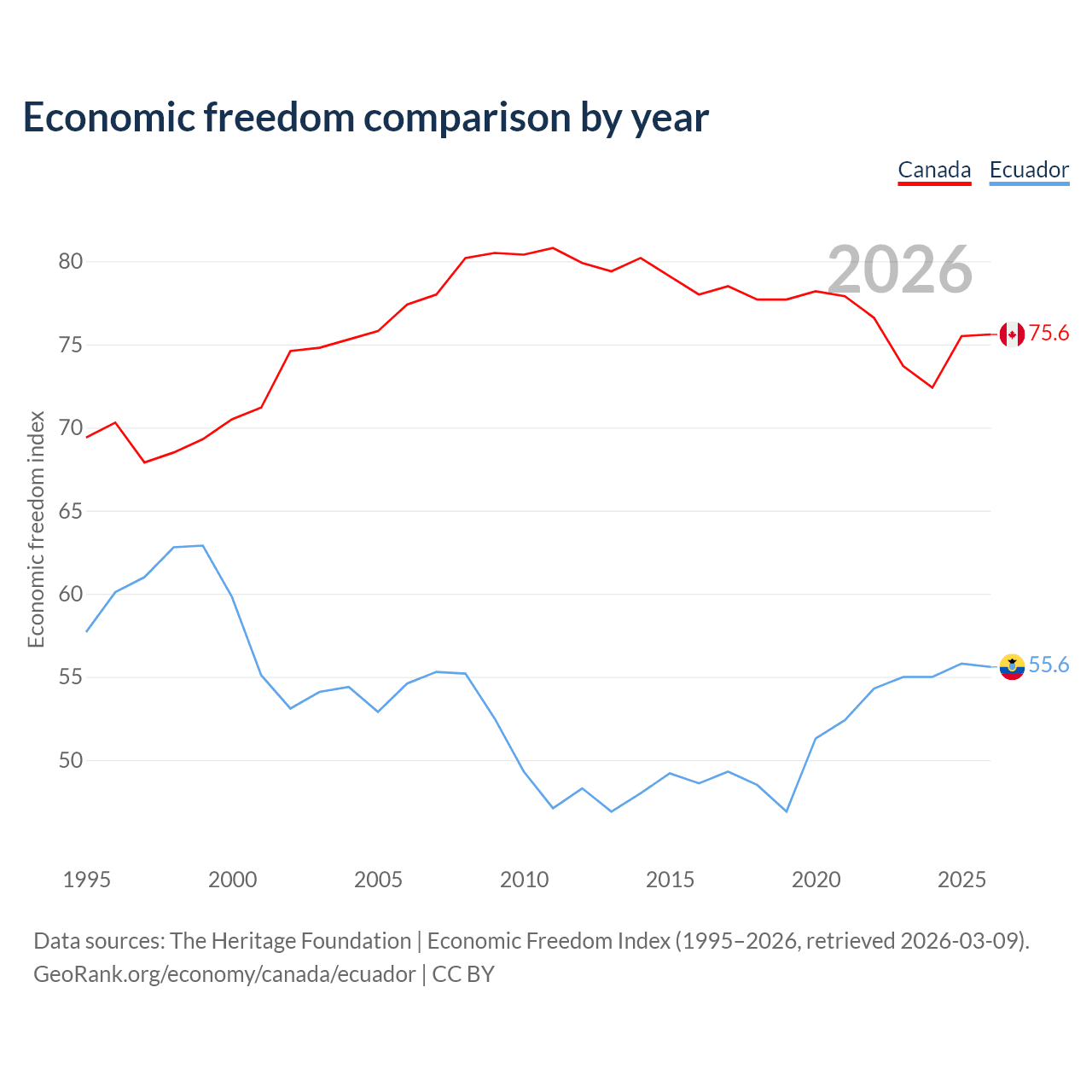 The Economic Freedom Index for Canada is 75.6, ranking 17/197, compared to 55.6 for Ecuador, ranking 127/197. The chart above displays a comparison of annual changes in economic freedom indexes.