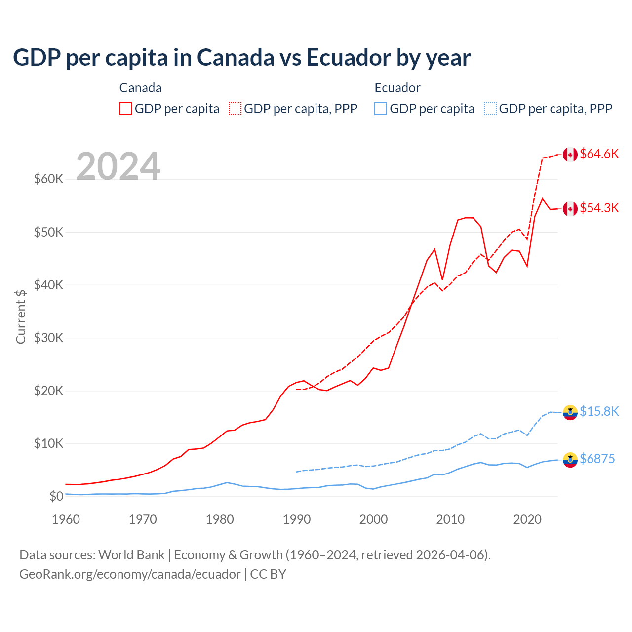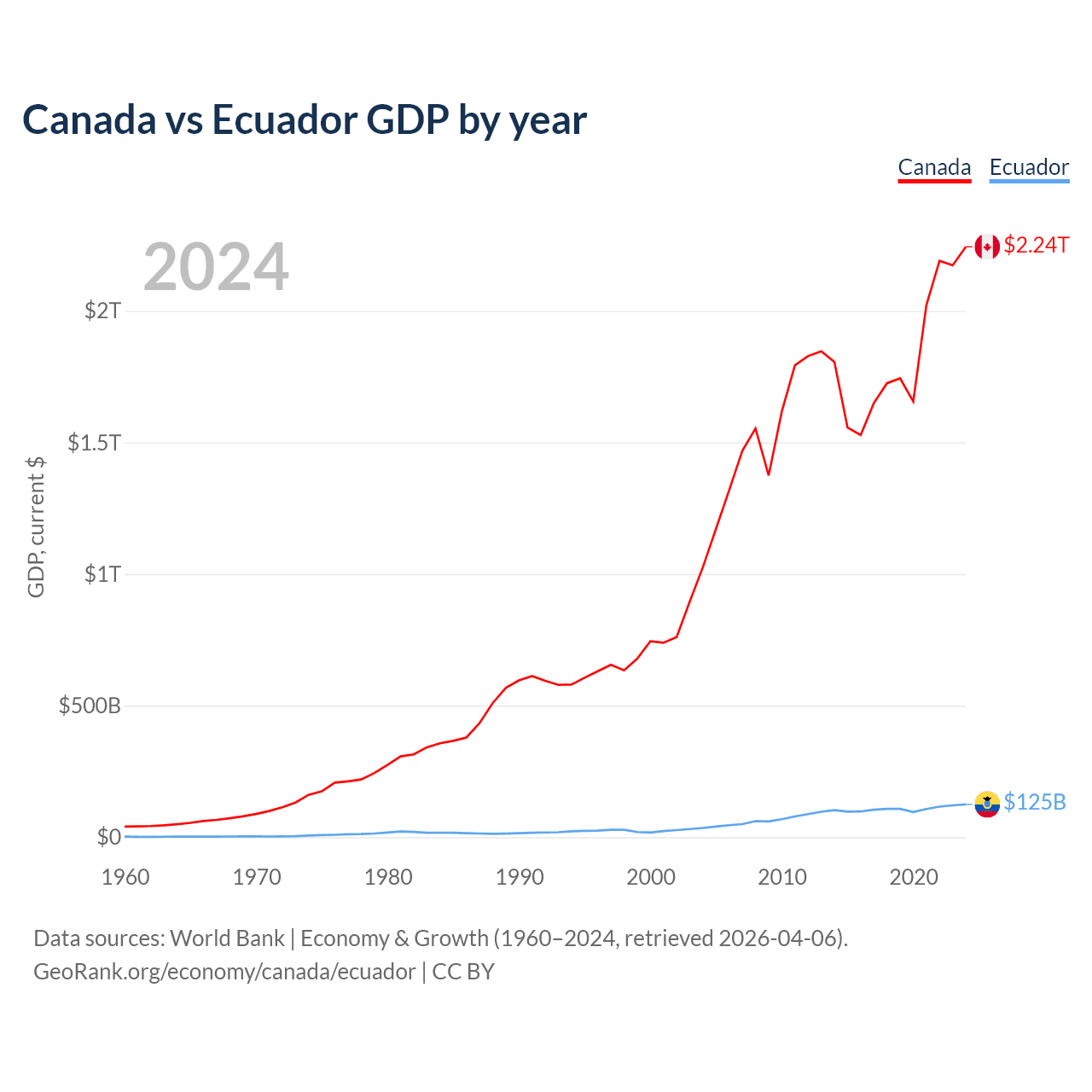 Canada has a GDP of $2.24T compared to $125B for Ecuador, ranking 9/197 and 62/197 by economy size, respectively.