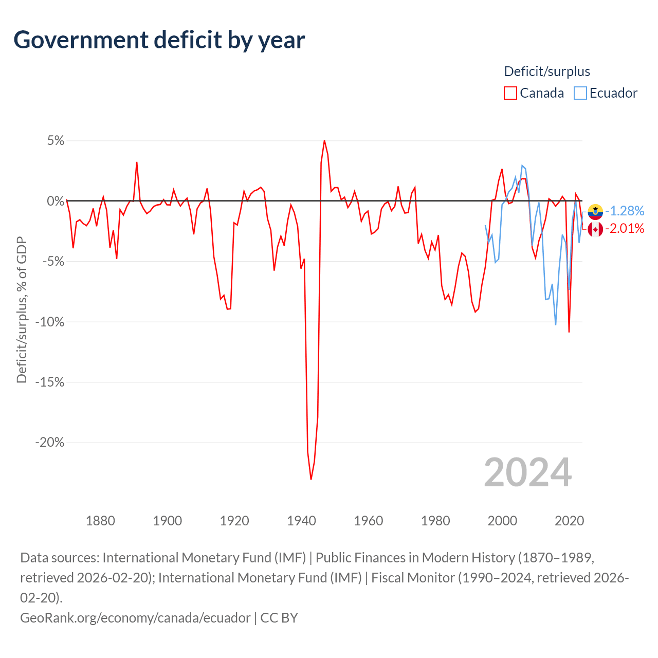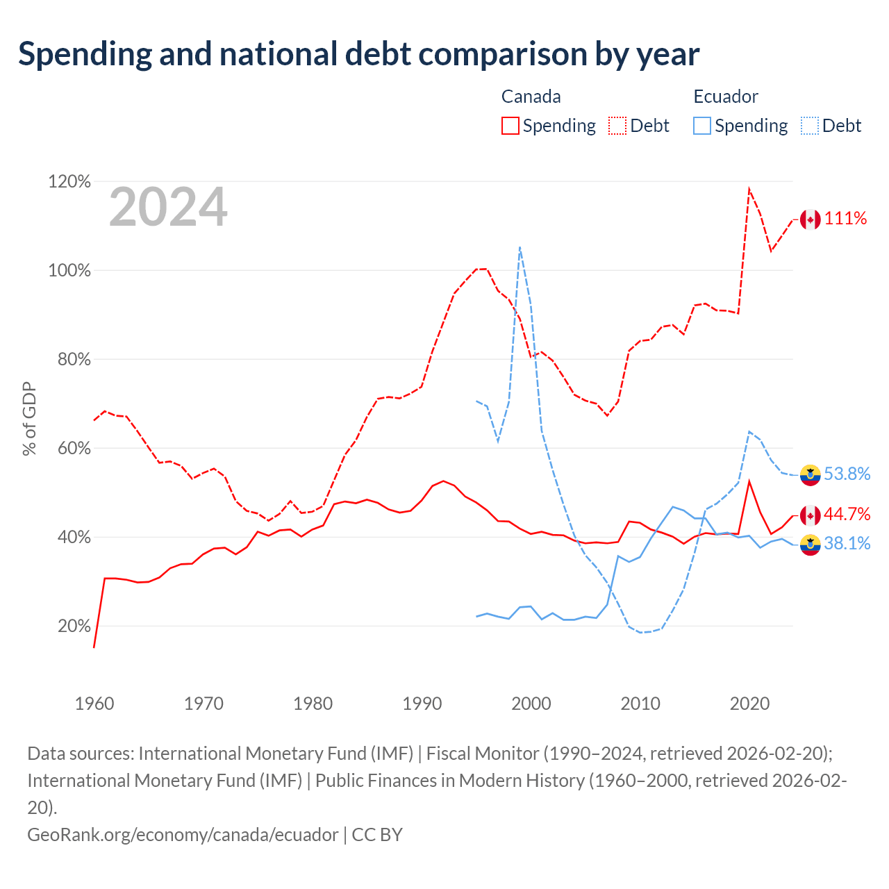 Canada has $2.5T in government debt (111.3% of GDP), compared to $67B (53.8% of GDP) in Ecuador.