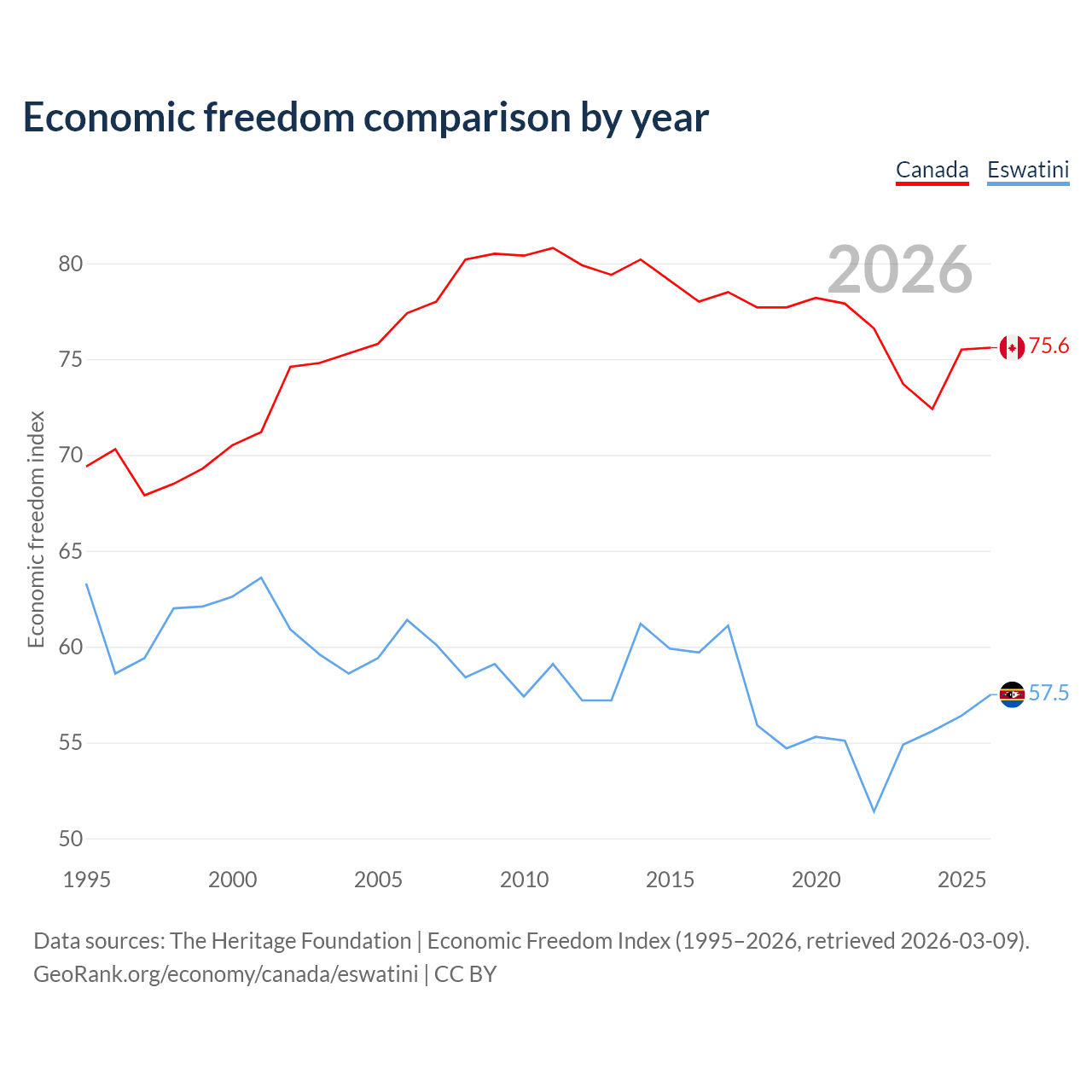 The Economic Freedom Index for Canada is 75.6, ranking 17/197, compared to 57.5 for Eswatini, ranking 116/197. The chart above displays a comparison of annual changes in economic freedom indexes.