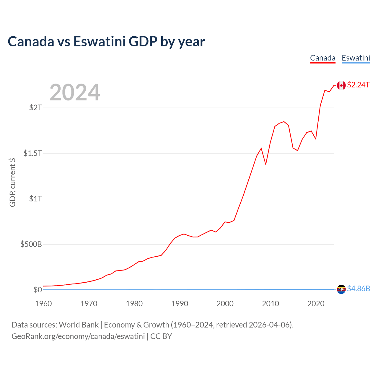 Canada has a GDP of $2.24T compared to $4.86B for Eswatini, ranking 9/197 and 162/197 by economy size, respectively.