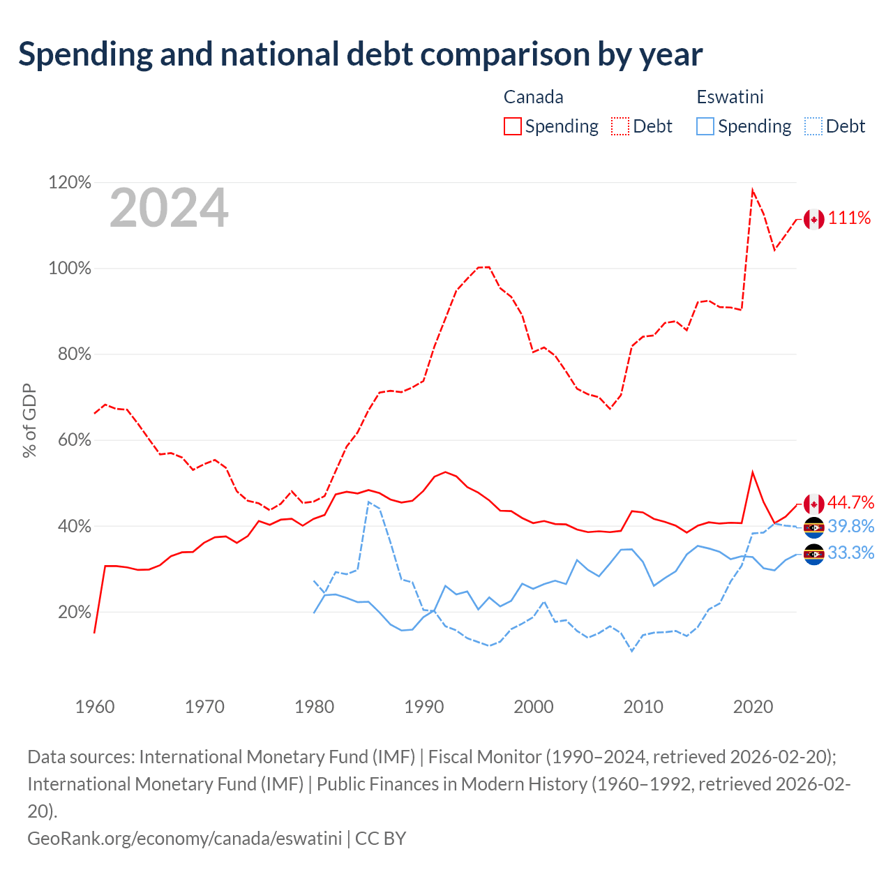 Canada has $2.5T in government debt (111.3% of GDP), compared to $1.93B (39.8% of GDP) in Eswatini.