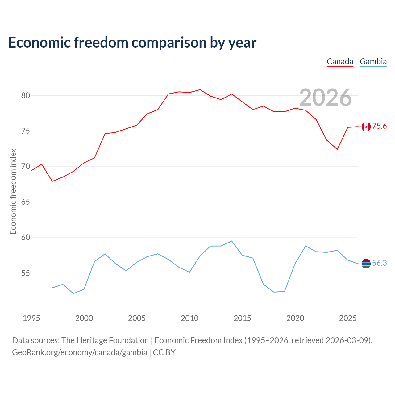 The Economic Freedom Index for Canada is 75.6, ranking 17/197, compared to 56.3 for the Gambia, ranking 123/197. The chart above displays a comparison of annual changes in economic freedom indexes.