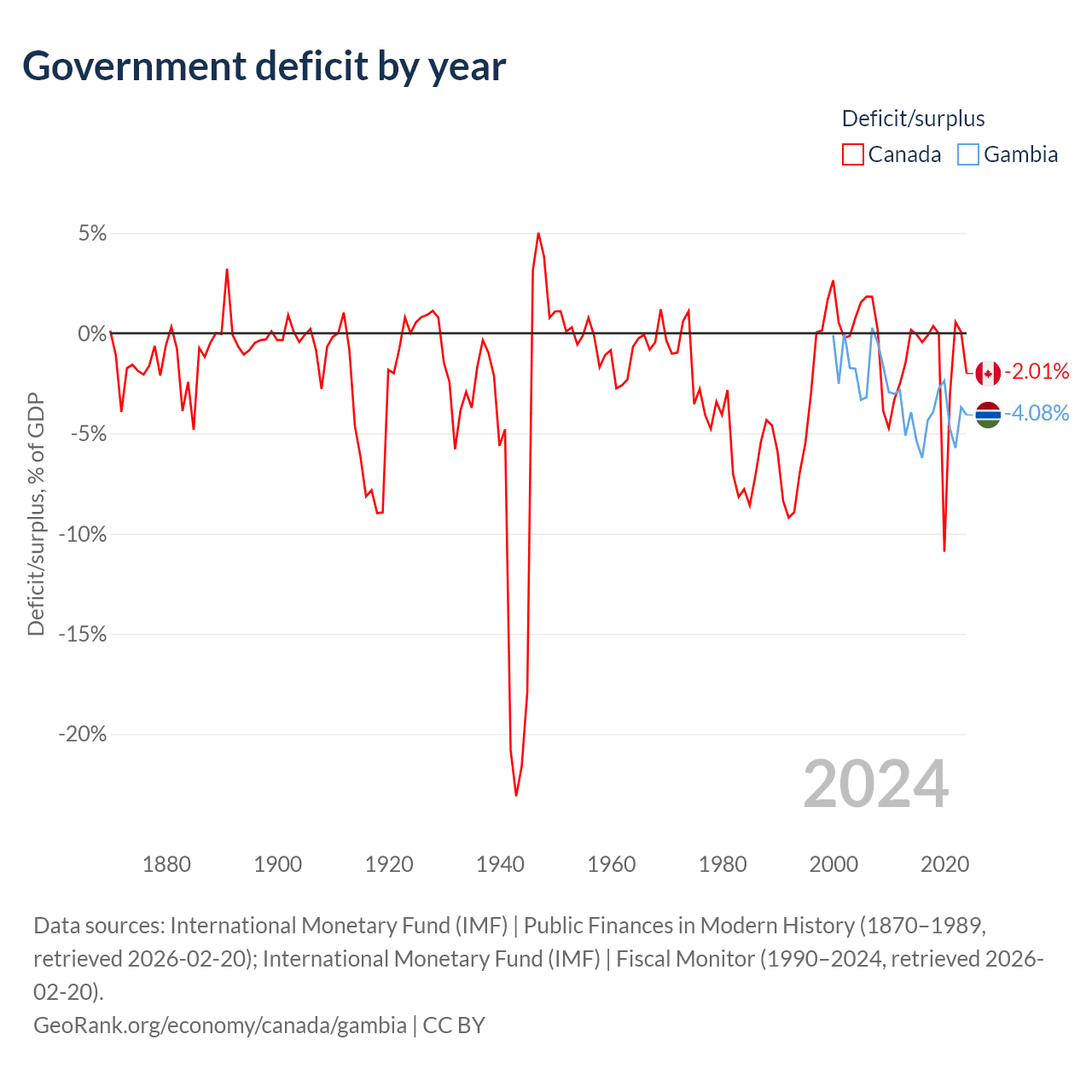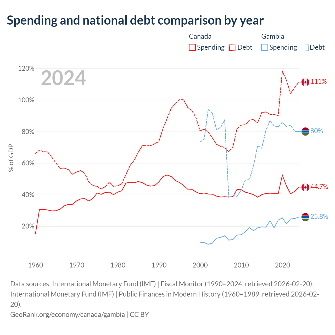 Canada has $2.5T in government debt (111.3% of GDP), compared to $1.92B (80% of GDP) in the Gambia.