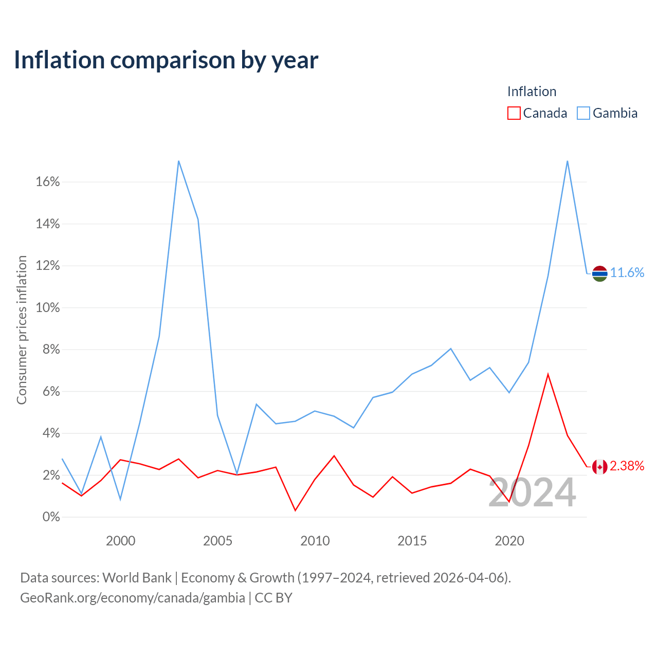 Canada has a GDP of $2.24T compared to $2.4B for the Gambia, ranking 9/197 and 174/197 by economy size, respectively.