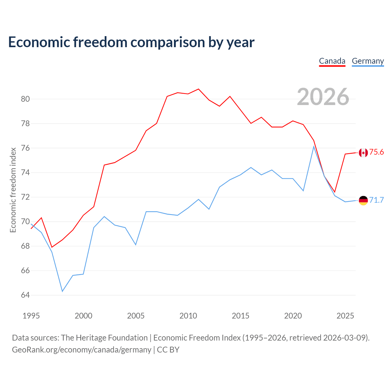 The Economic Freedom Index for Canada is 75.6, ranking 17/197, compared to 71.7 for Germany, ranking 30/197. The chart above displays a comparison of annual changes in economic freedom indexes.