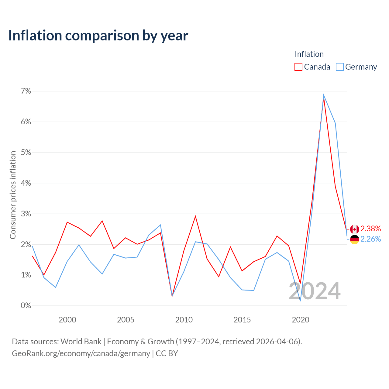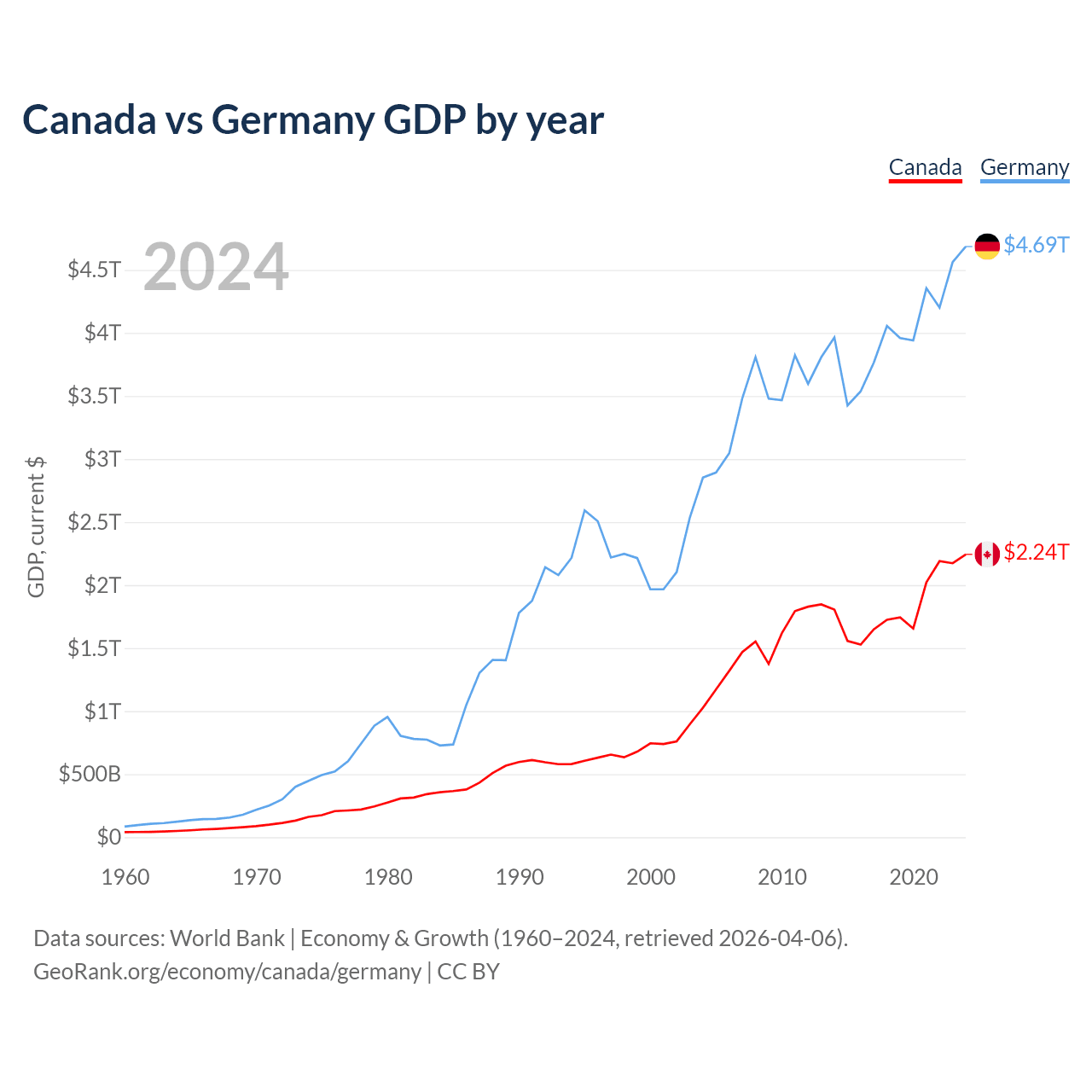 Canada has a GDP of $2.24T compared to $4.69T for Germany, ranking 9/197 and 3/197 by economy size, respectively.