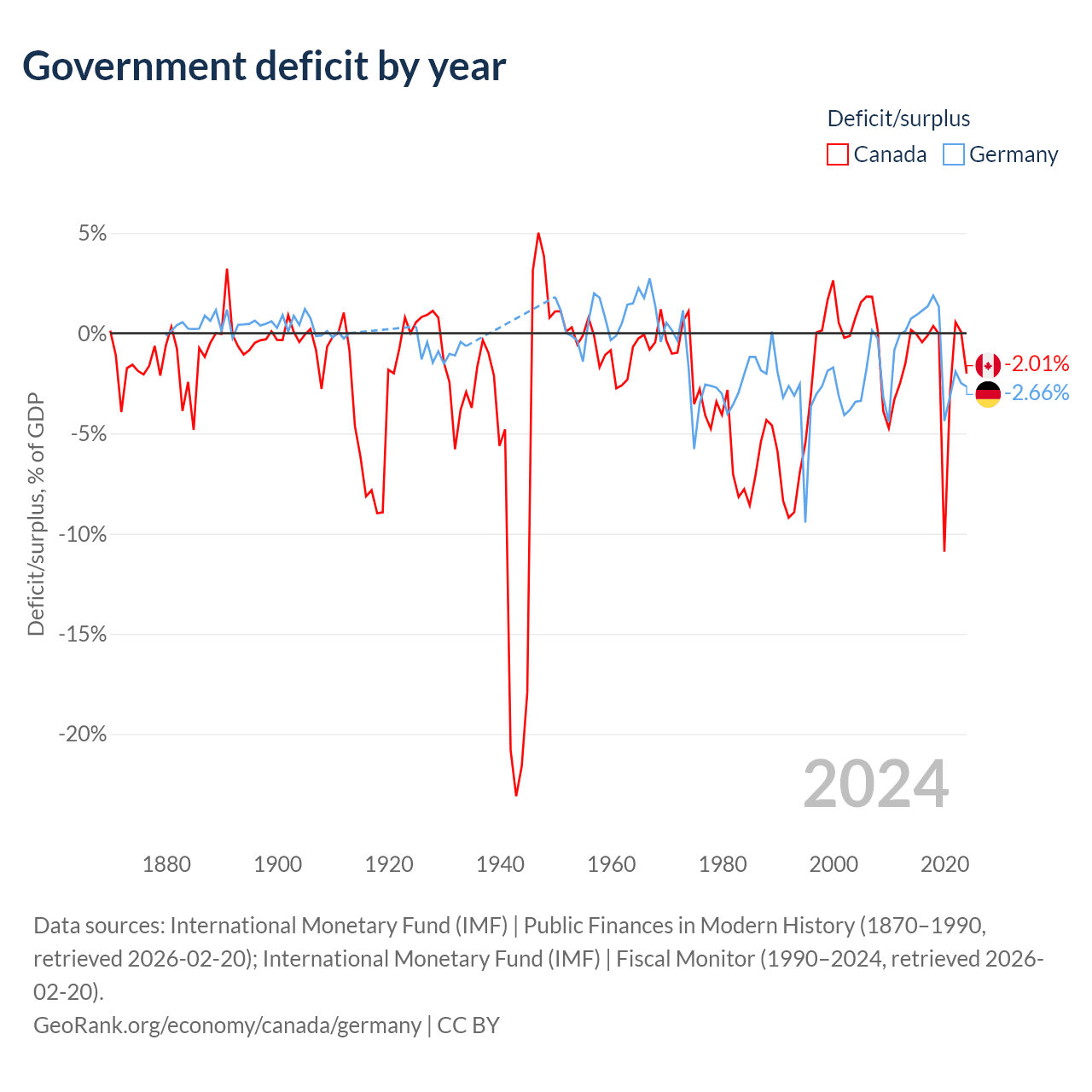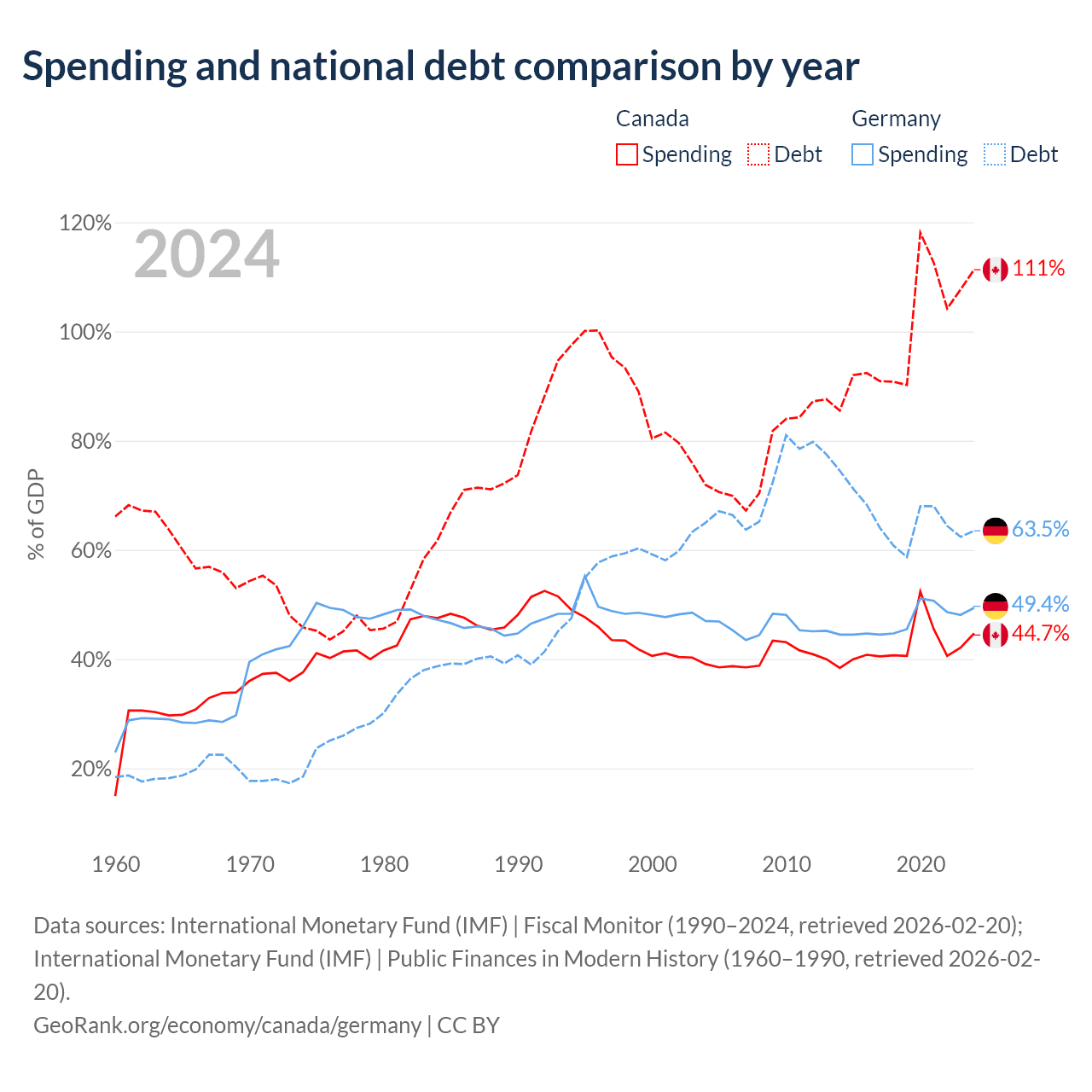 Canada has $2.5T in government debt (111.3% of GDP), compared to $2.97T (63.5% of GDP) in Germany.