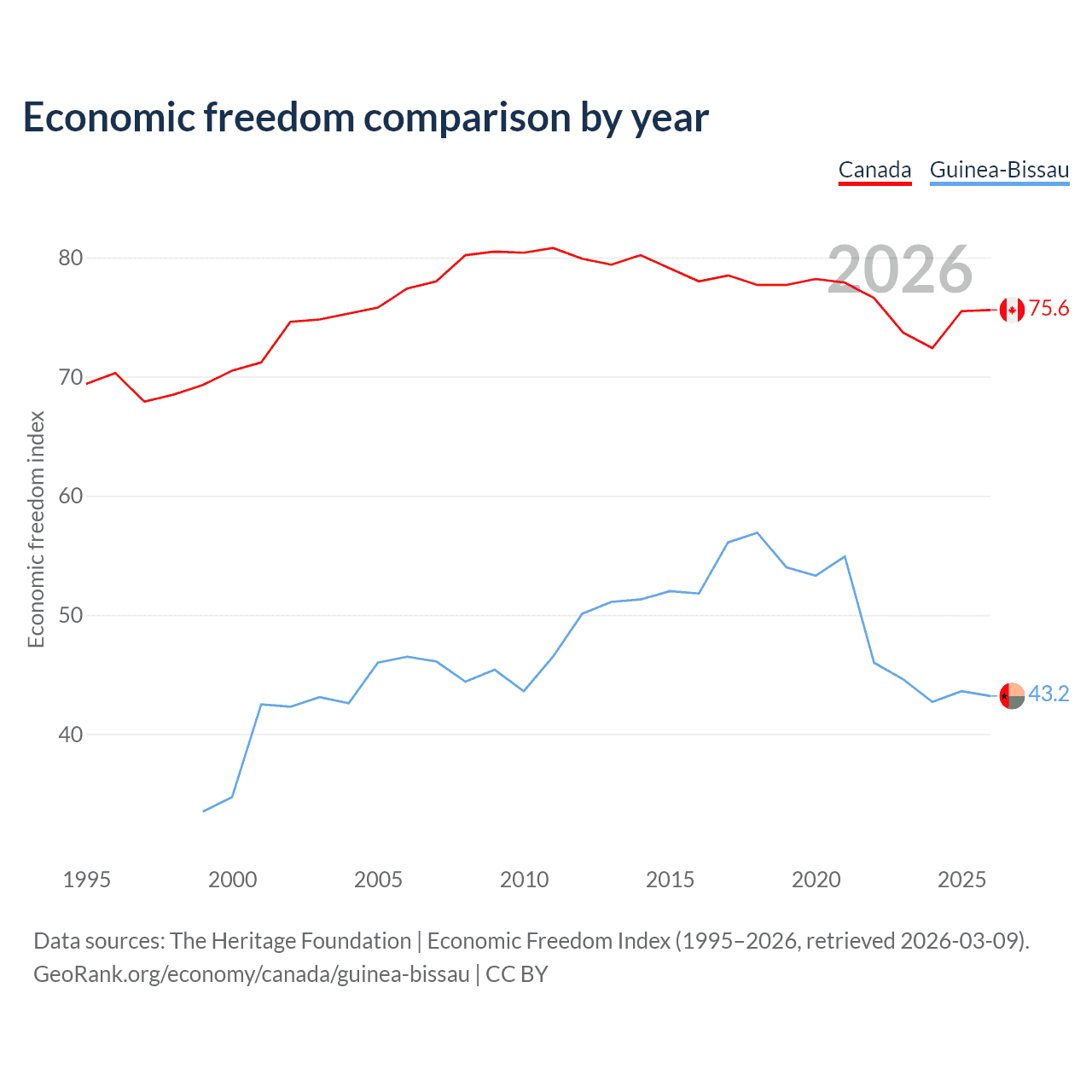 The Economic Freedom Index for Canada is 75.6, ranking 17/197, compared to 43.2 for Guinea-Bissau, ranking 181/197. The chart above displays a comparison of annual changes in economic freedom indexes.