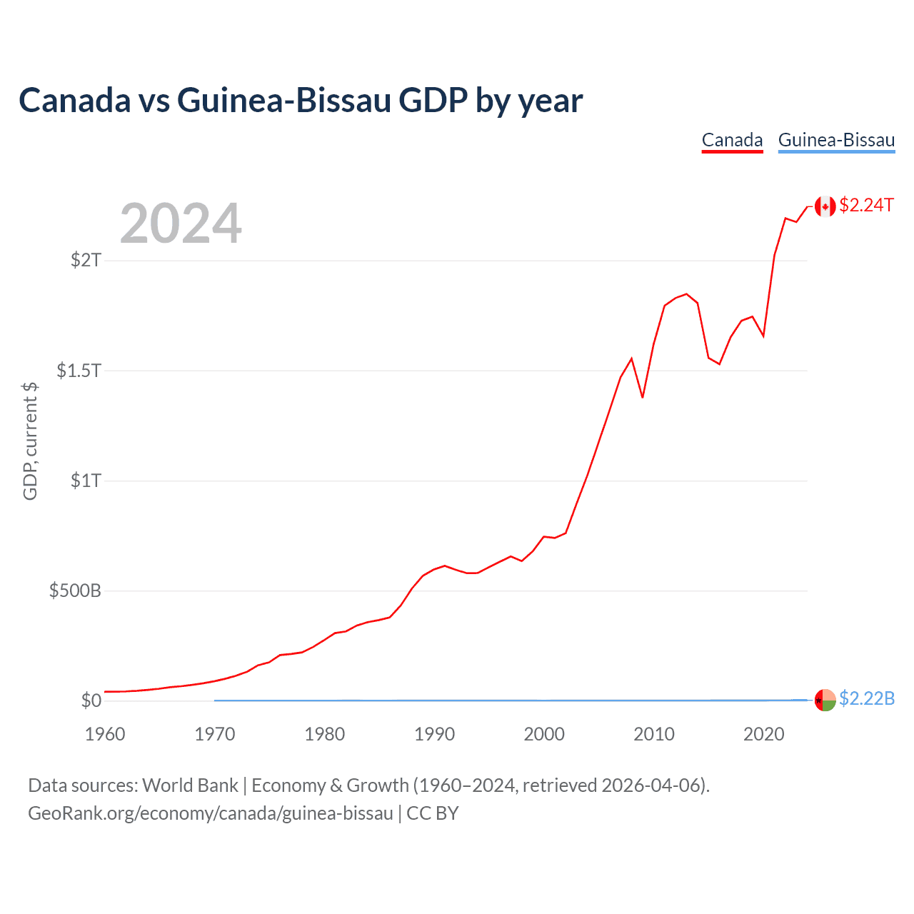 Canada has a GDP of $2.24T compared to $2.22B for Guinea-Bissau, ranking 9/197 and 176/197 by economy size, respectively.