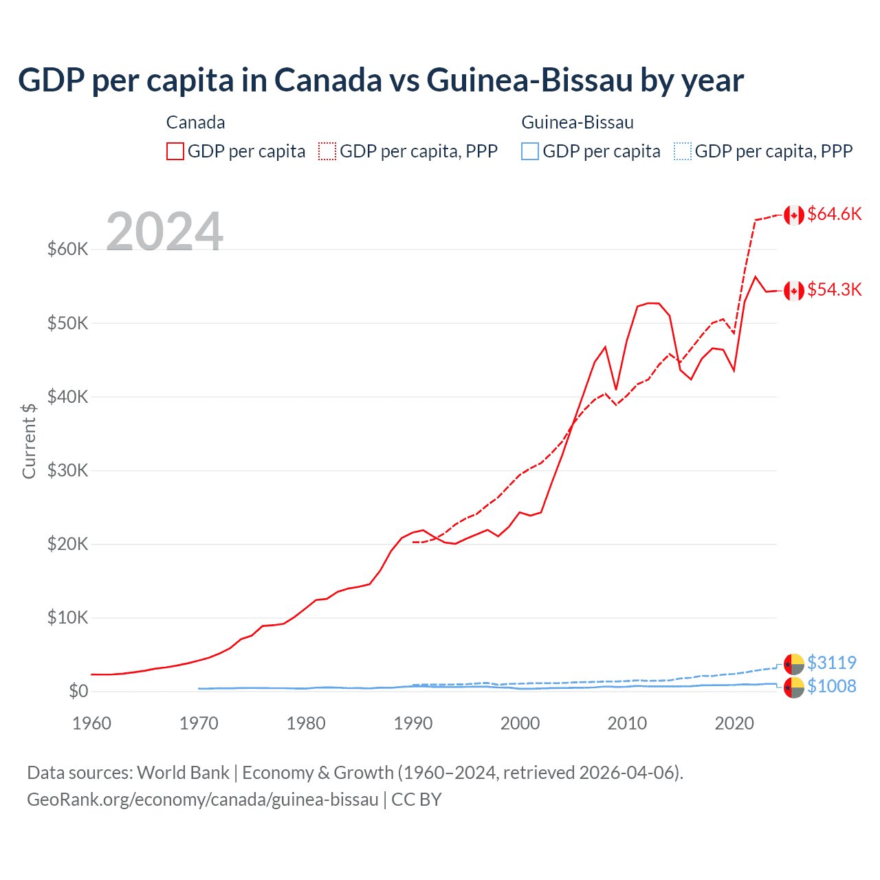 GDP per capita in Canada vs Guinea-Bissau by year