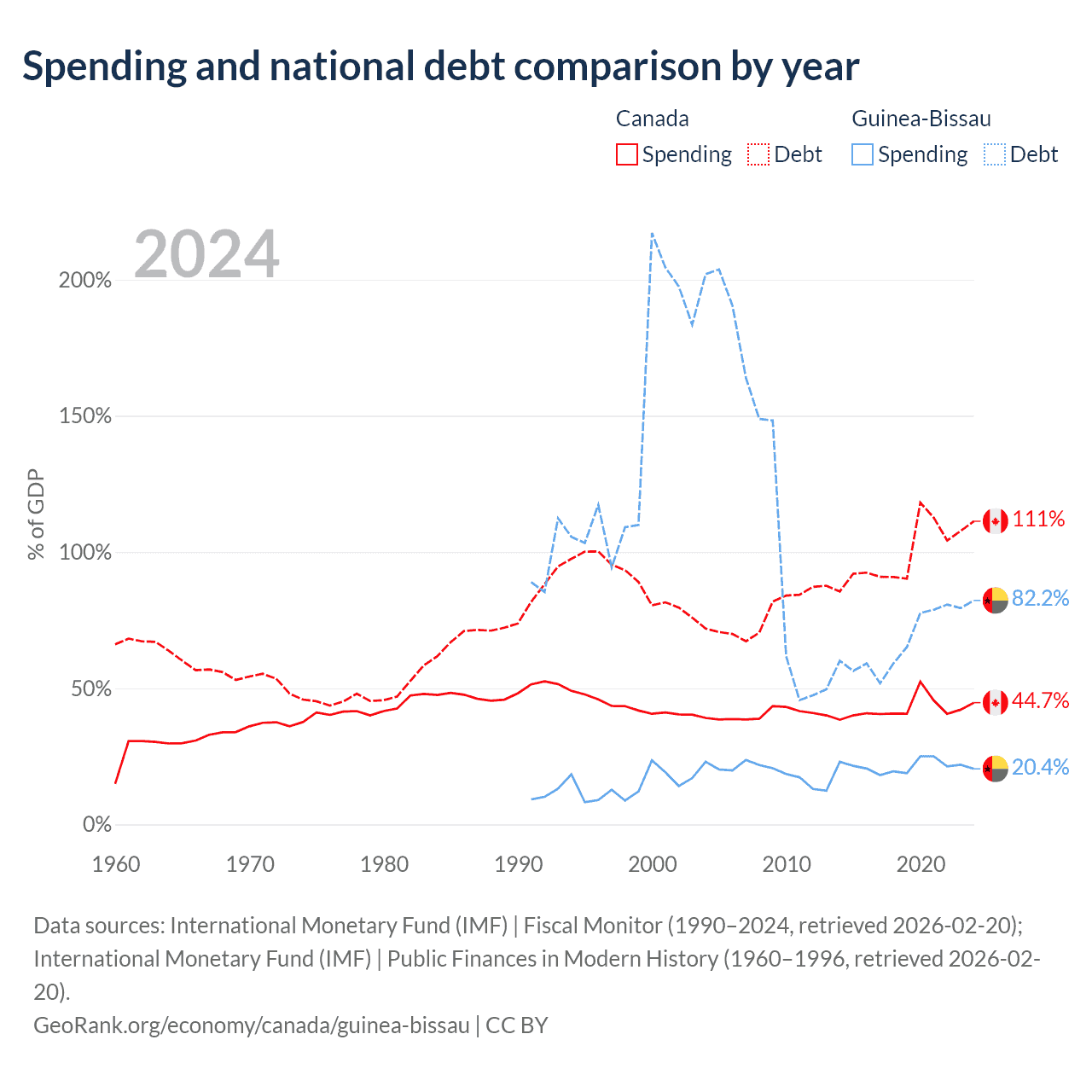 Canada has $2.5T in government debt (111.3% of GDP), compared to $1.82B (82.2% of GDP) in Guinea-Bissau.