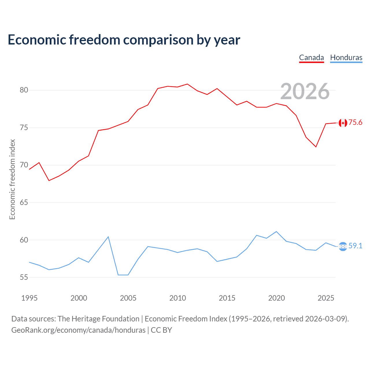 The Economic Freedom Index for Canada is 75.6, ranking 17/197, compared to 59.1 for Honduras, ranking 105/197. The chart above displays a comparison of annual changes in economic freedom indexes.