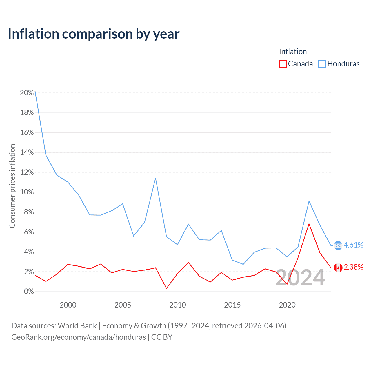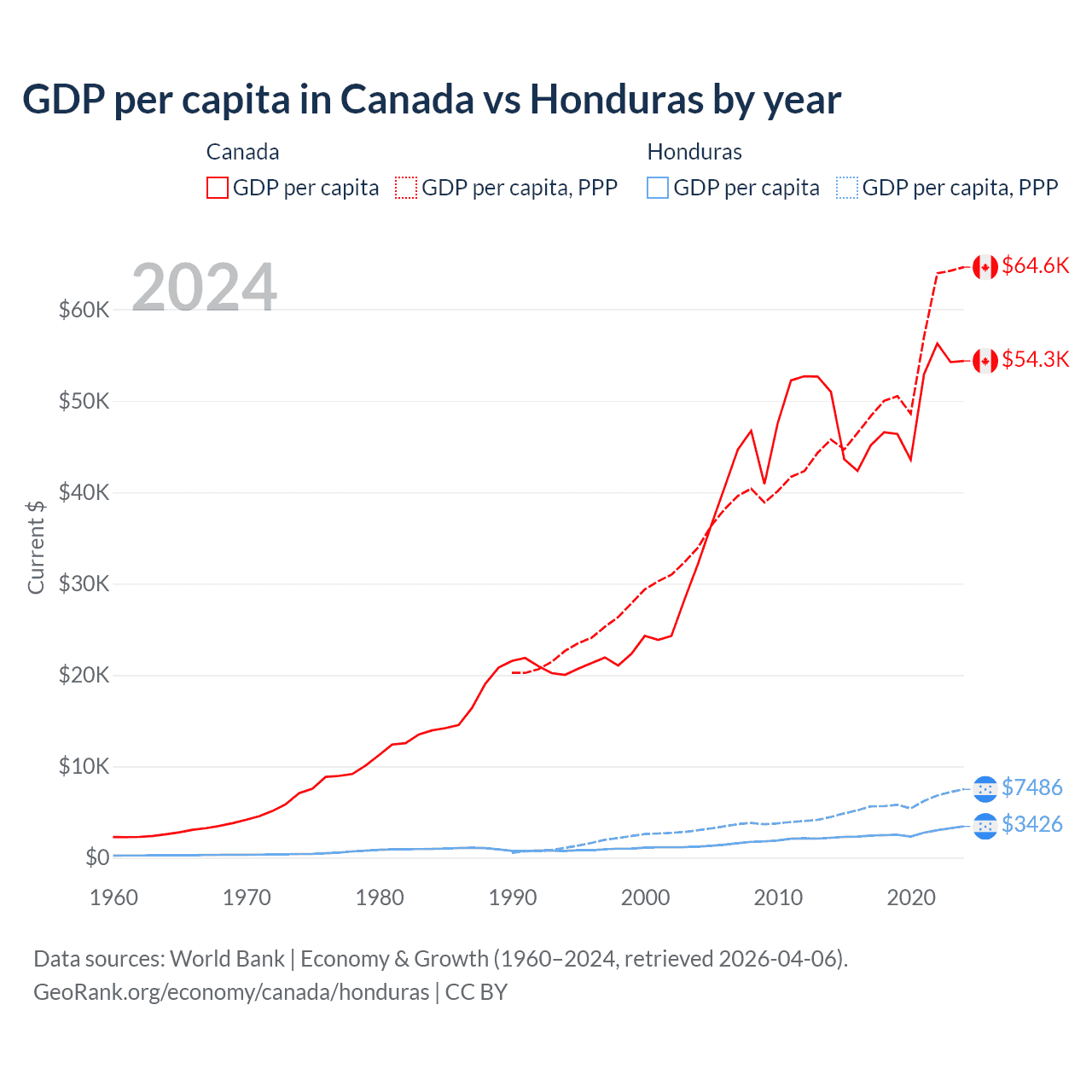 Canada has a GDP of $2.24T compared to $37.1B for Honduras, ranking 9/197 and 104/197 by economy size, respectively.