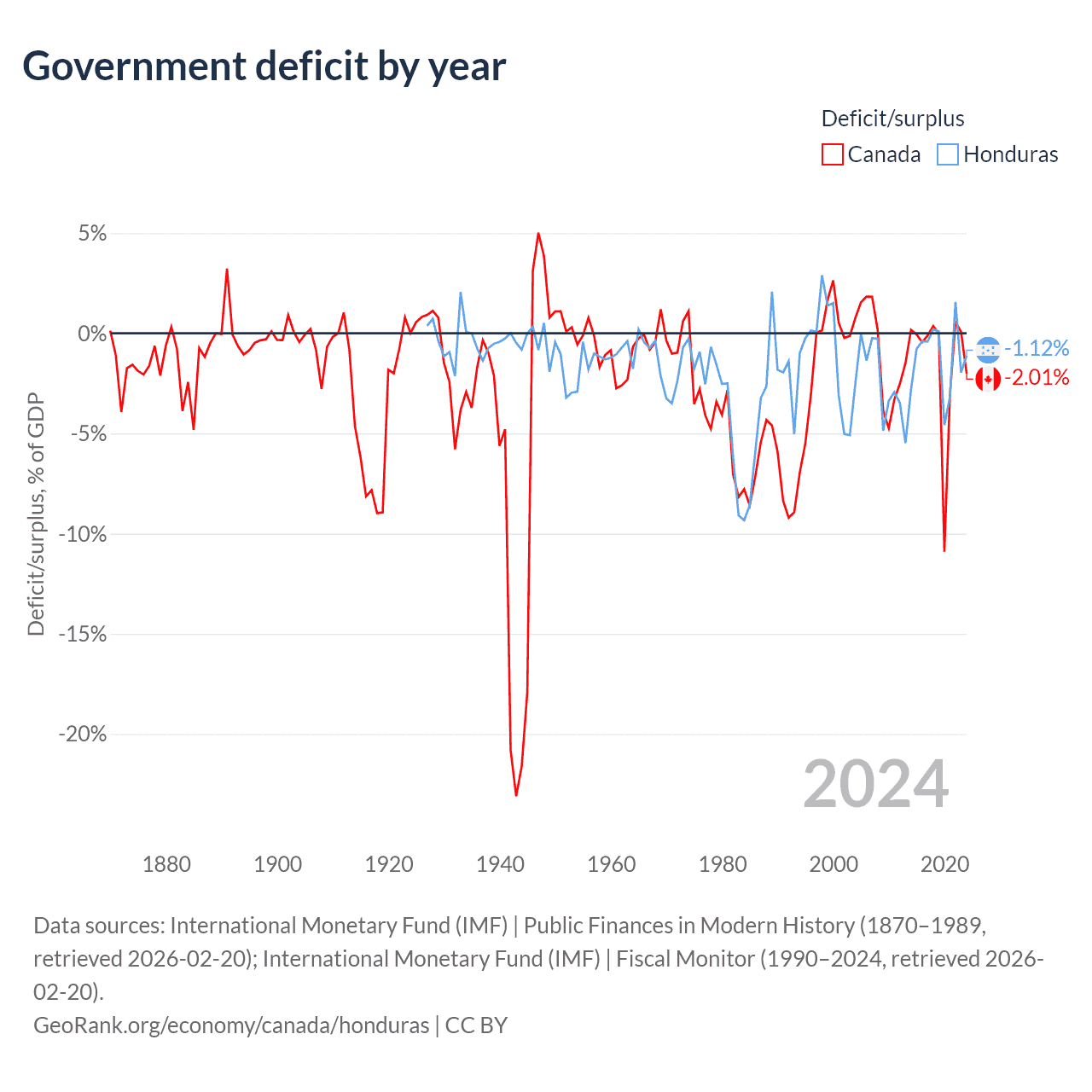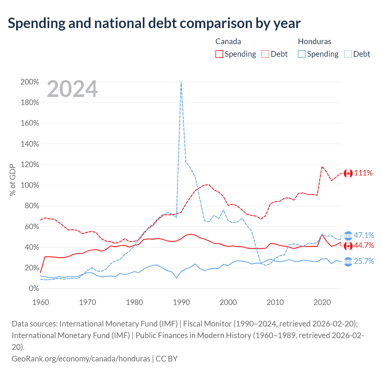 Canada has $2.5T in government debt (111.3% of GDP), compared to $17.5B (47.1% of GDP) in Honduras.