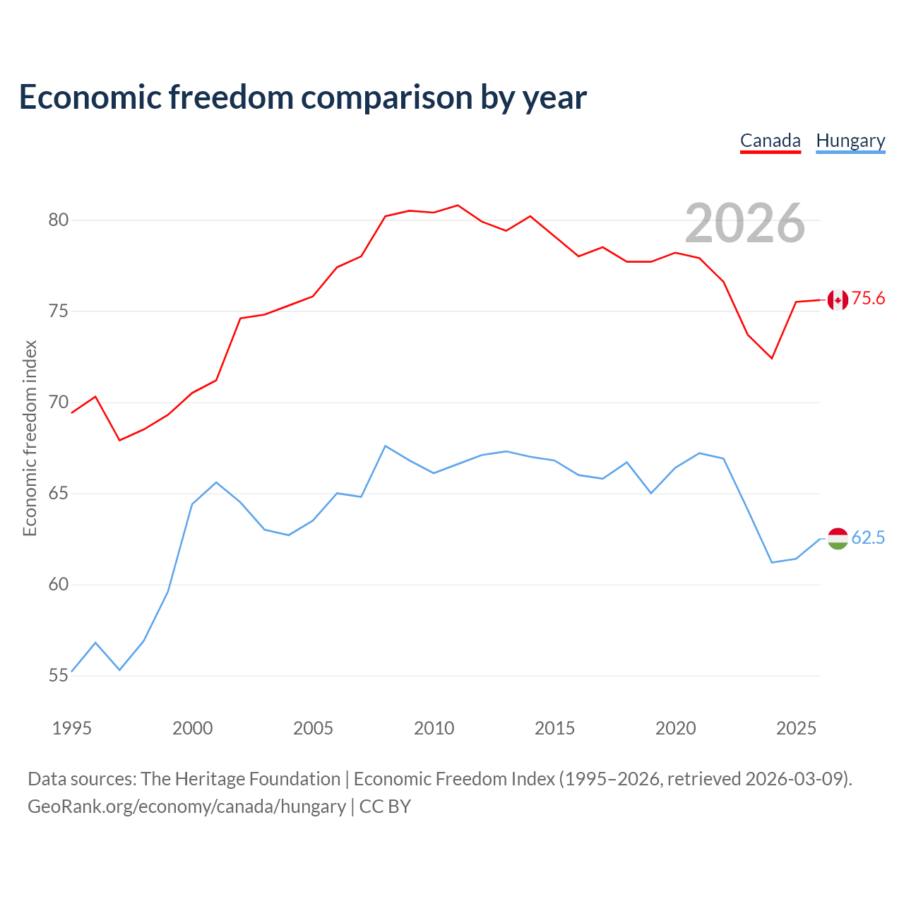 The Economic Freedom Index for Canada is 75.6, ranking 17/197, compared to 62.5 for Hungary, ranking 86/197. The chart above displays a comparison of annual changes in economic freedom indexes.
