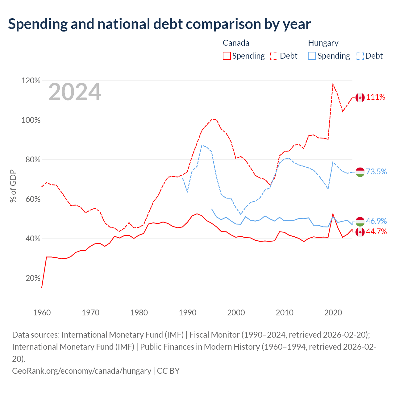 Canada has $2.5T in government debt (111.3% of GDP), compared to $164B (73.5% of GDP) in Hungary.