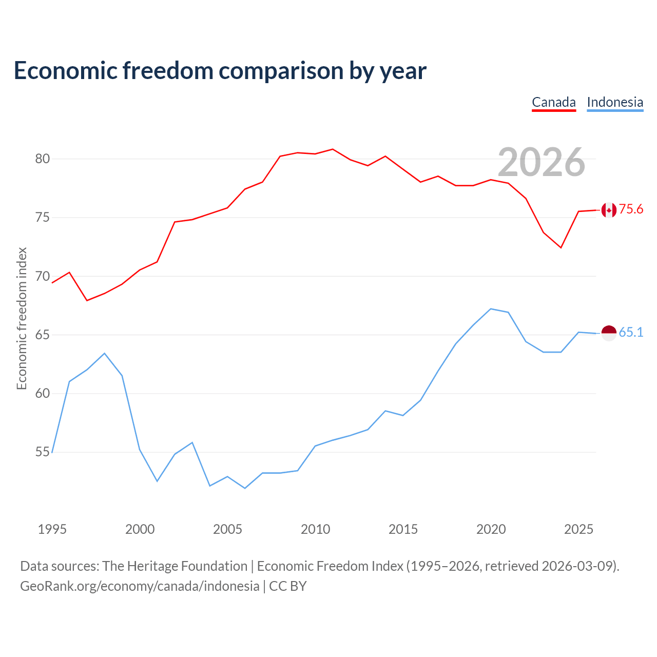 The Economic Freedom Index for Canada is 75.6, ranking 17/197, compared to 65.1 for Indonesia, ranking 67/197. The chart above displays a comparison of annual changes in economic freedom indexes.