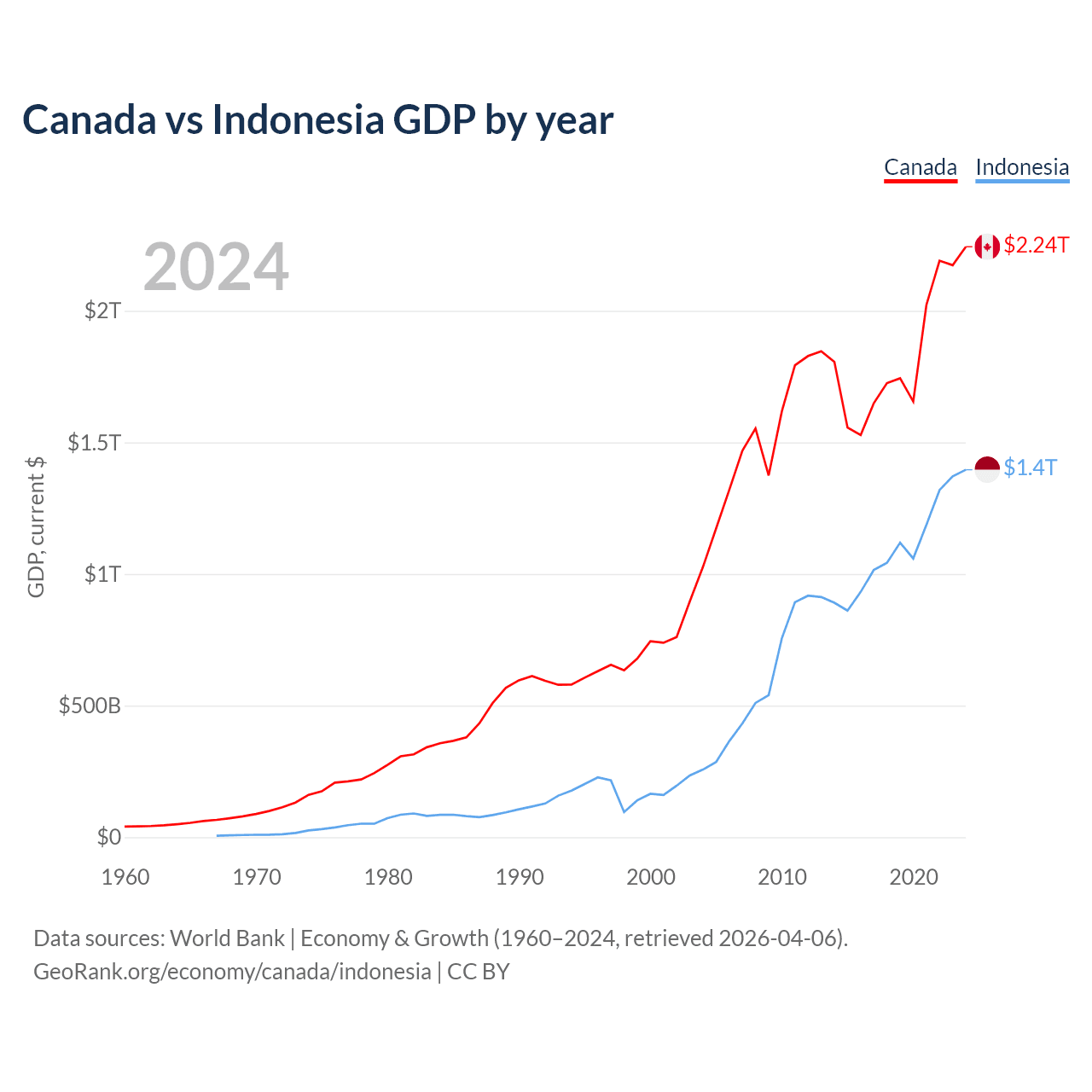 Canada has a GDP of $2.24T compared to $1.4T for Indonesia, ranking 9/197 and 16/197 by economy size, respectively.