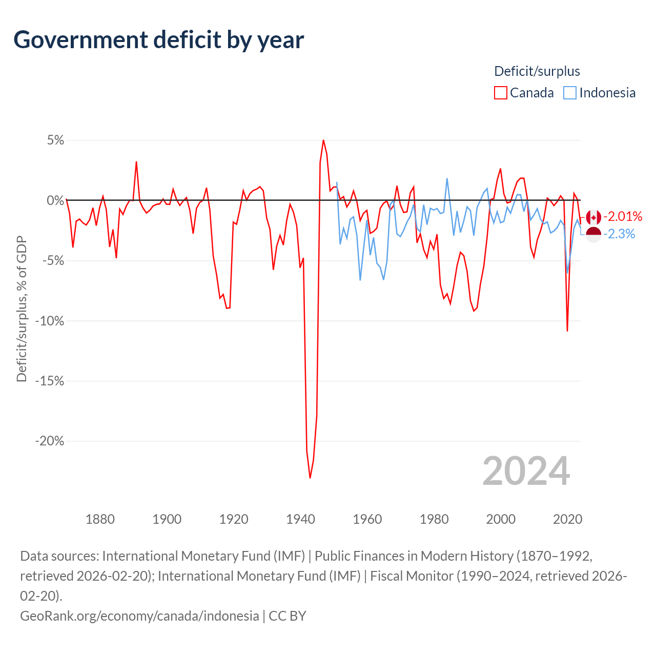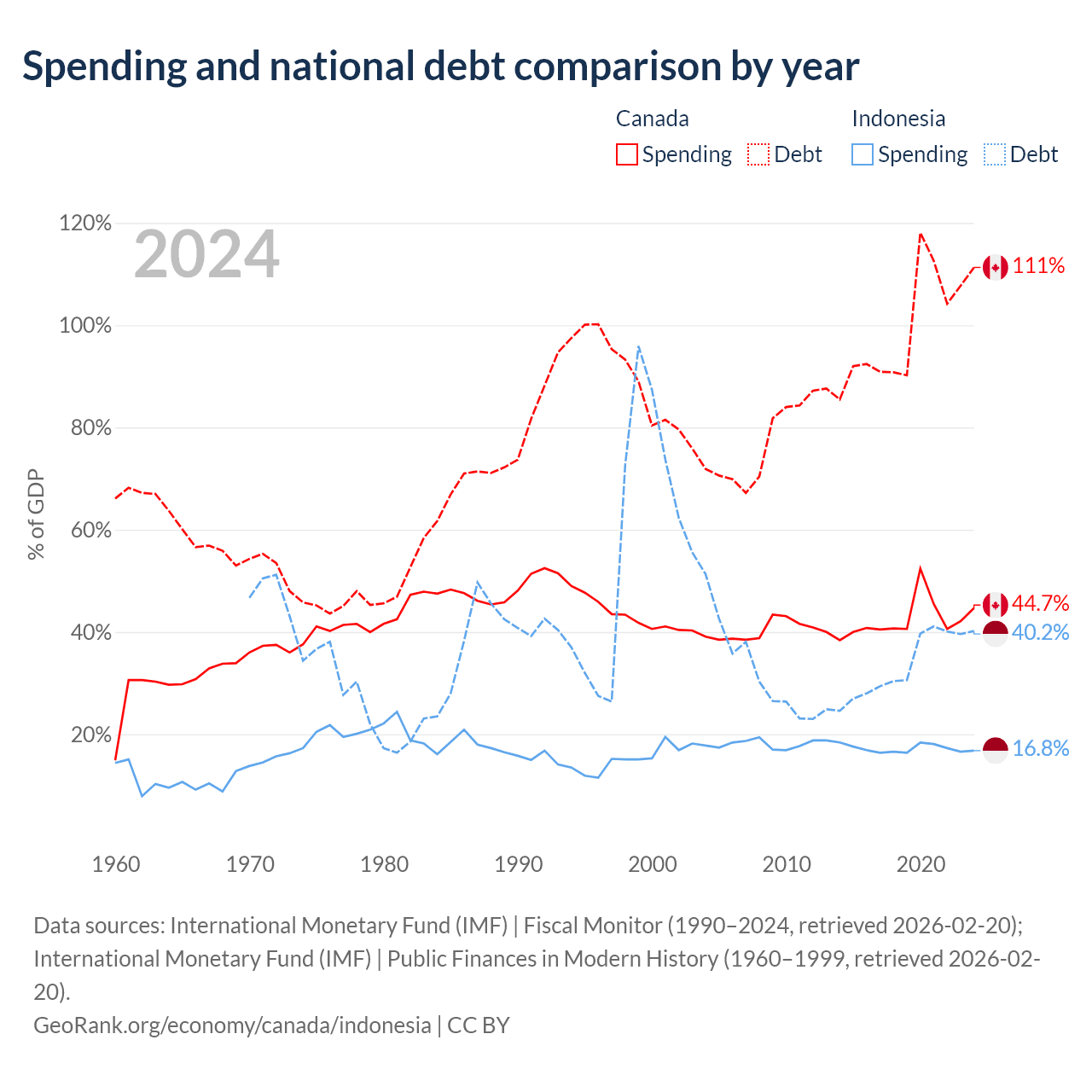 Canada has $2.5T in government debt (111.3% of GDP), compared to $561B (40.2% of GDP) in Indonesia.