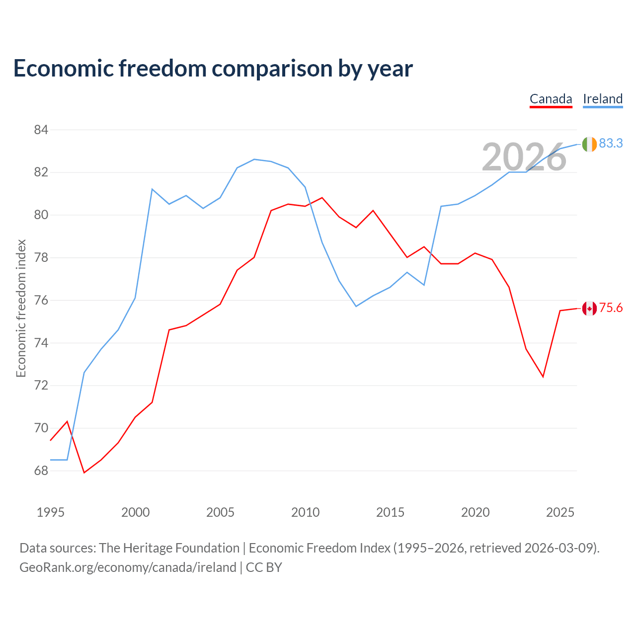 The Economic Freedom Index for Canada is 75.6, ranking 17/197, compared to 83.3 for Ireland, ranking 3/197. The chart above displays a comparison of annual changes in economic freedom indexes.