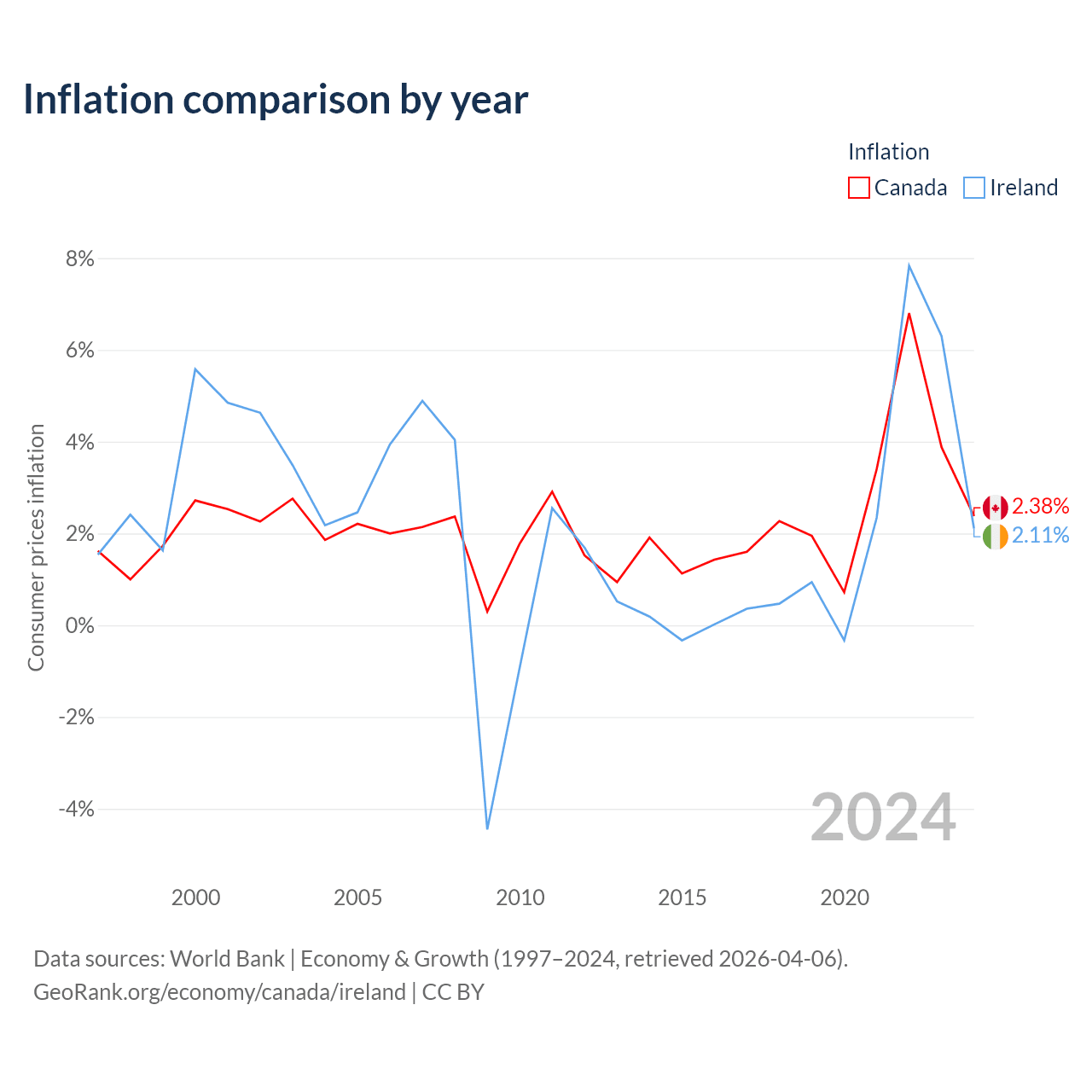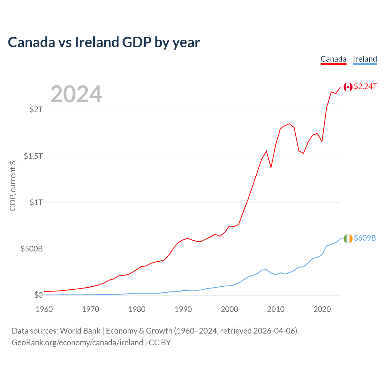 Canada has a GDP of $2.24T compared to $609B for Ireland, ranking 9/197 and 25/197 by economy size, respectively.