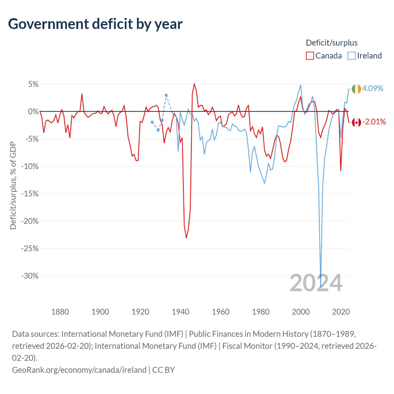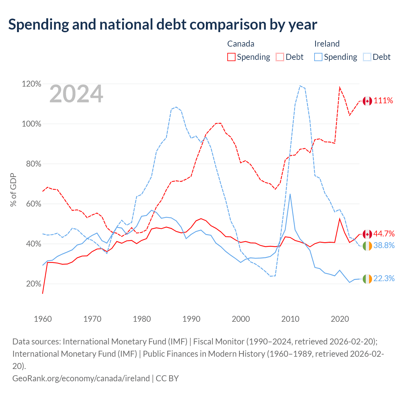 Canada has $2.5T in government debt (111.3% of GDP), compared to $236B (38.8% of GDP) in Ireland.