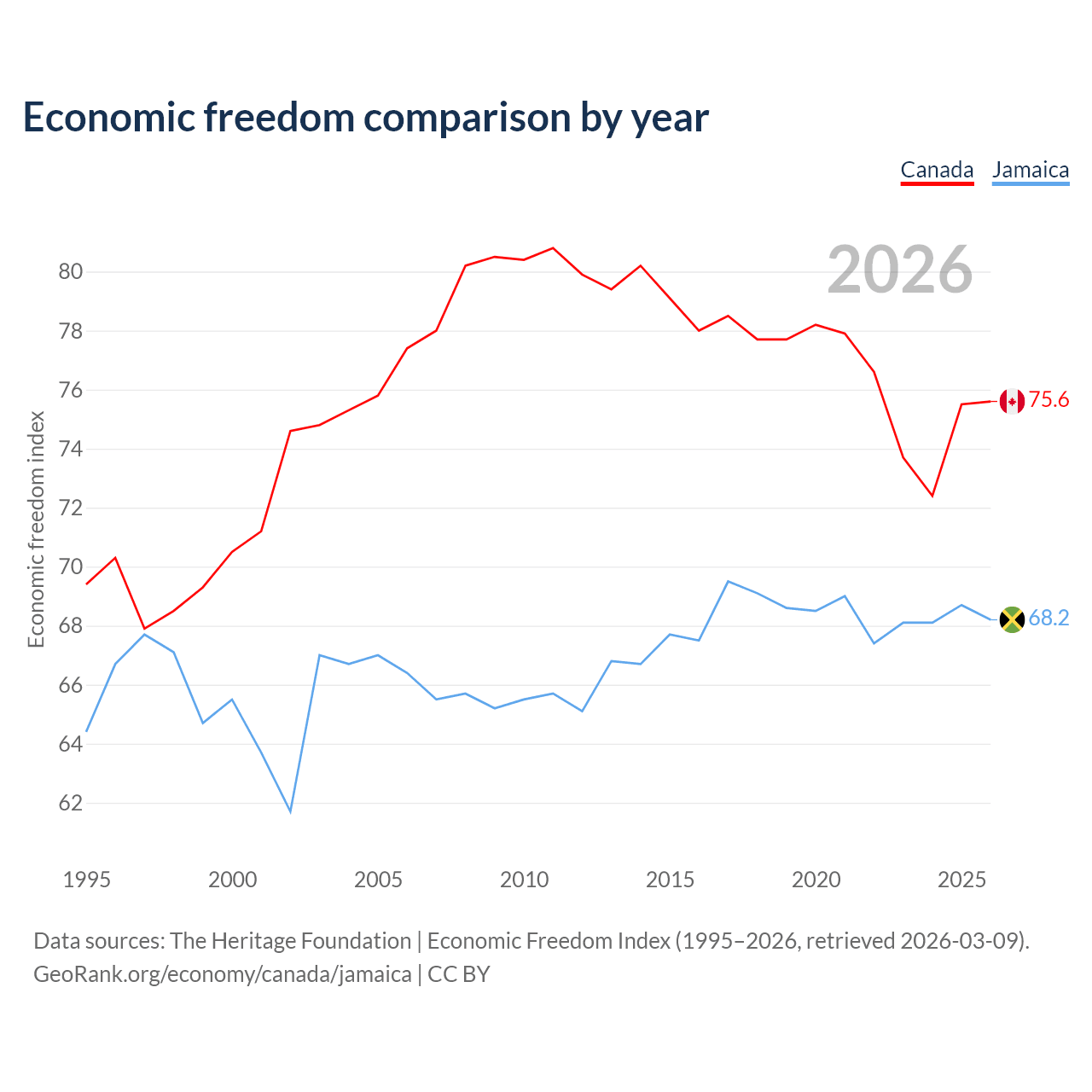 The Economic Freedom Index for Canada is 75.6, ranking 17/197, compared to 68.2 for Jamaica, ranking 48/197. The chart above displays a comparison of annual changes in economic freedom indexes.