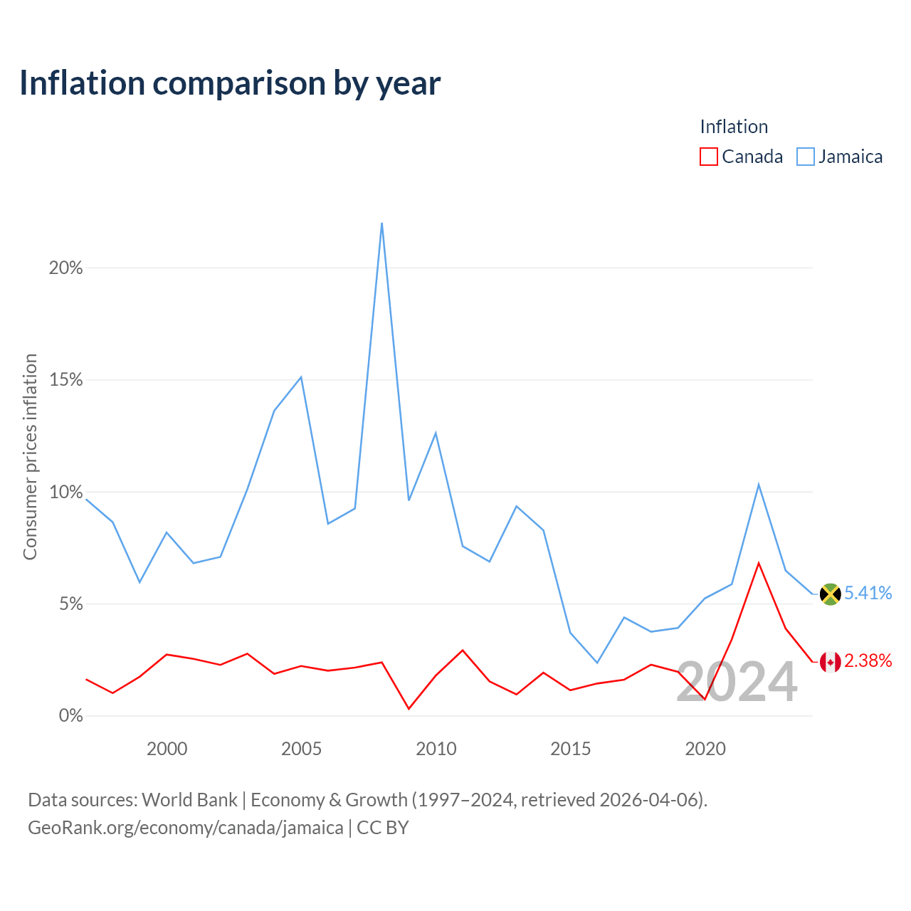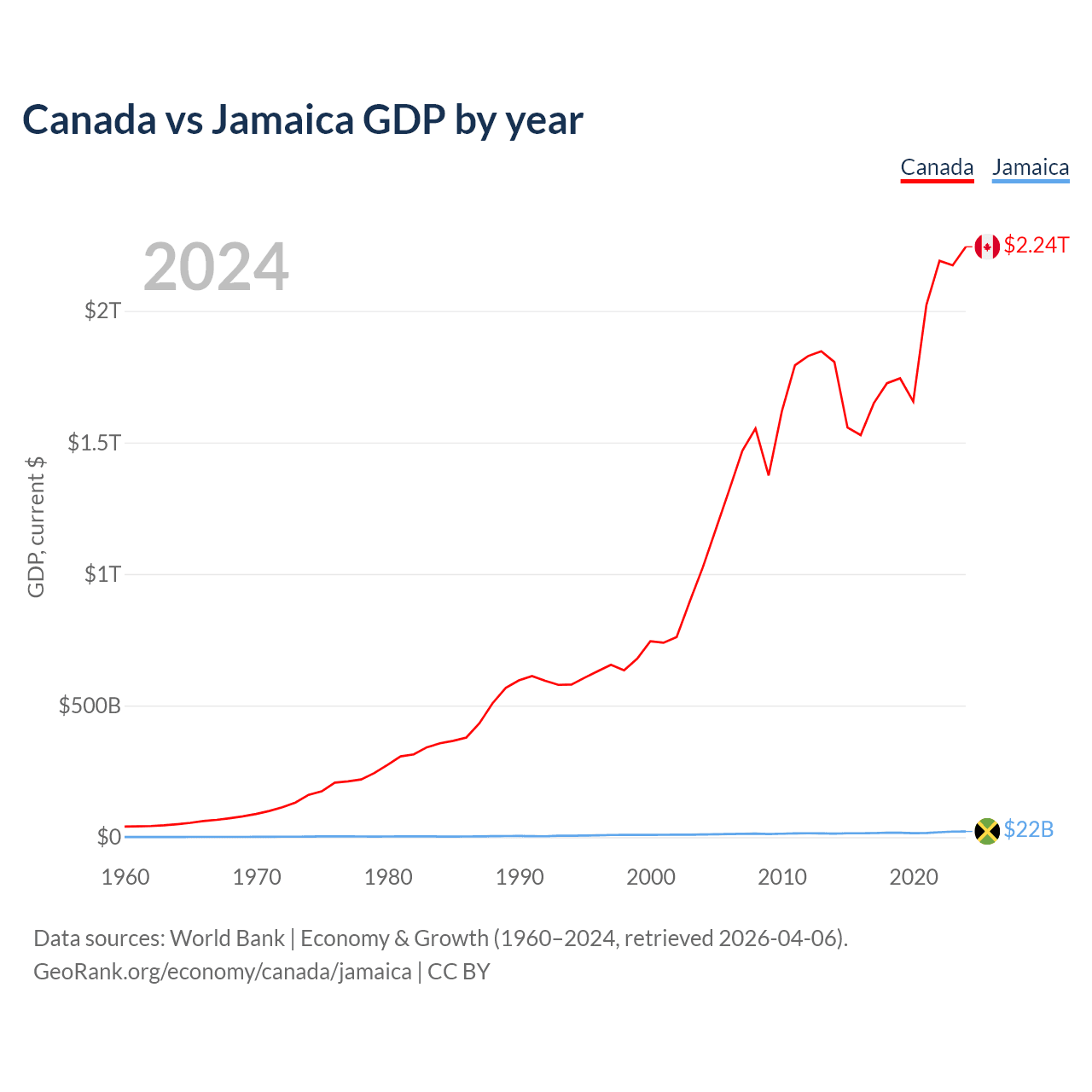 Canada has a GDP of $2.24T compared to $22B for Jamaica, ranking 9/197 and 124/197 by economy size, respectively.