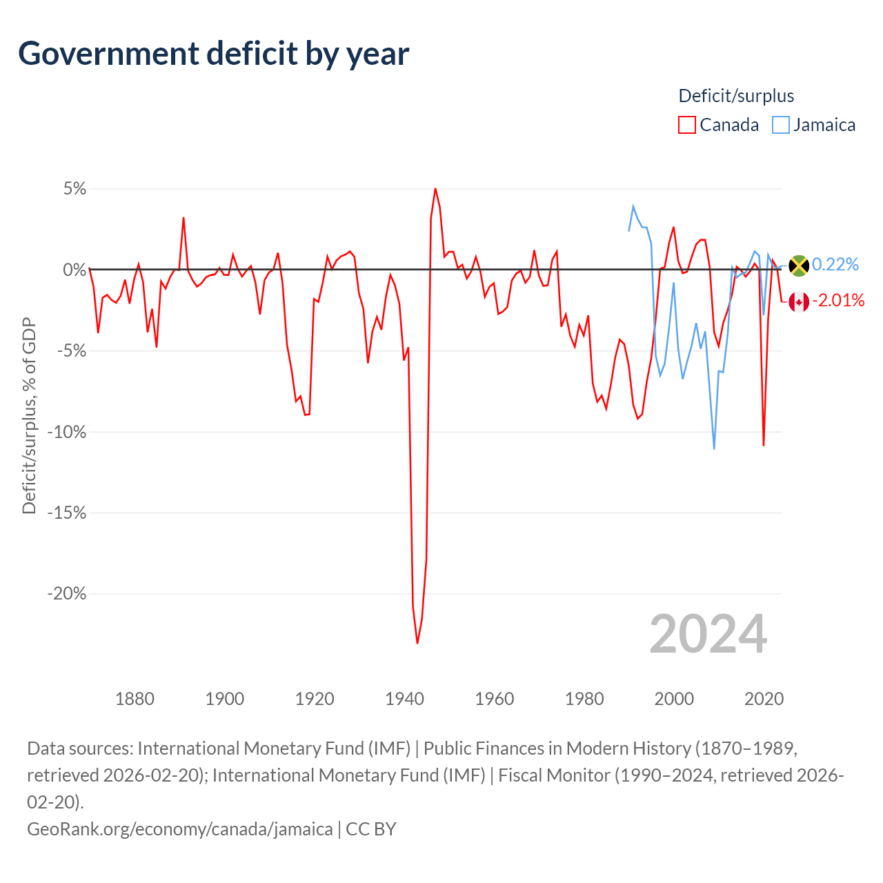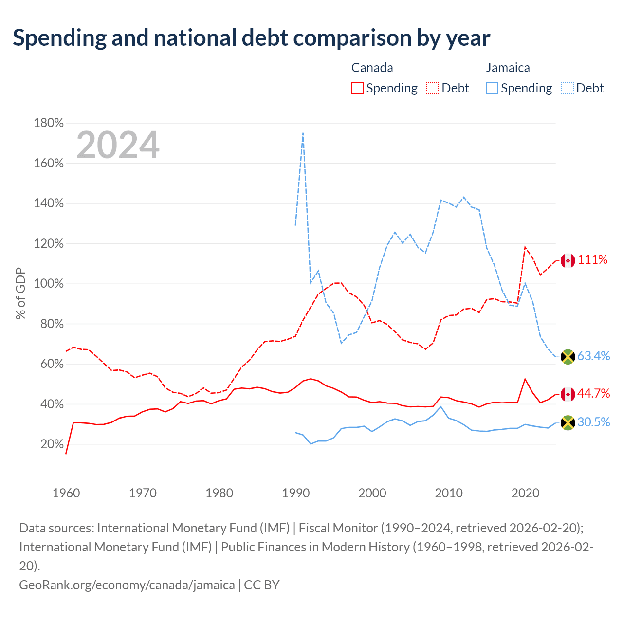 Canada has $2.5T in government debt (111.3% of GDP), compared to $14B (63.4% of GDP) in Jamaica.