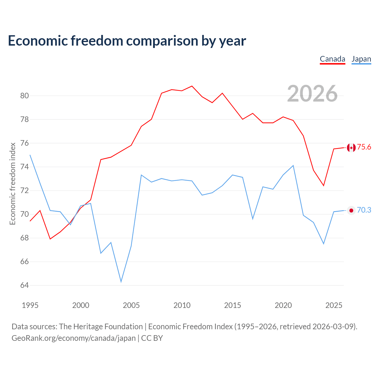 The Economic Freedom Index for Canada is 75.6, ranking 17/197, compared to 70.3 for Japan, ranking 36/197. The chart above displays a comparison of annual changes in economic freedom indexes.