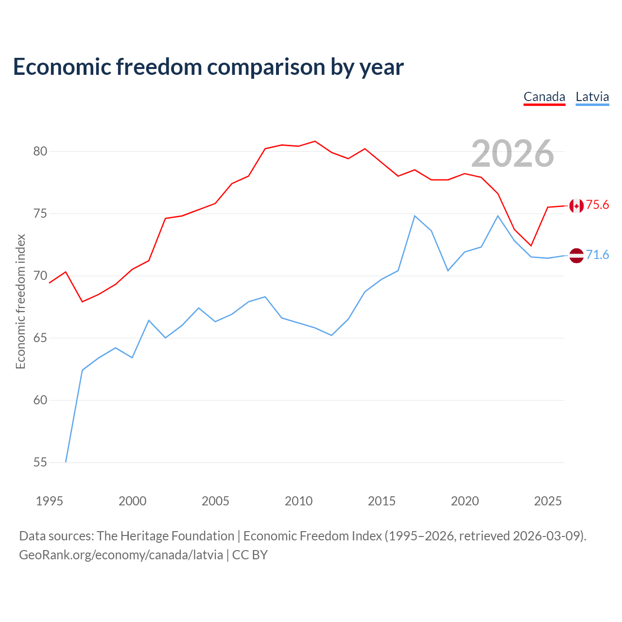 The Economic Freedom Index for Canada is 75.6, ranking 17/197, compared to 71.6 for Latvia, ranking 31/197. The chart above displays a comparison of annual changes in economic freedom indexes.
