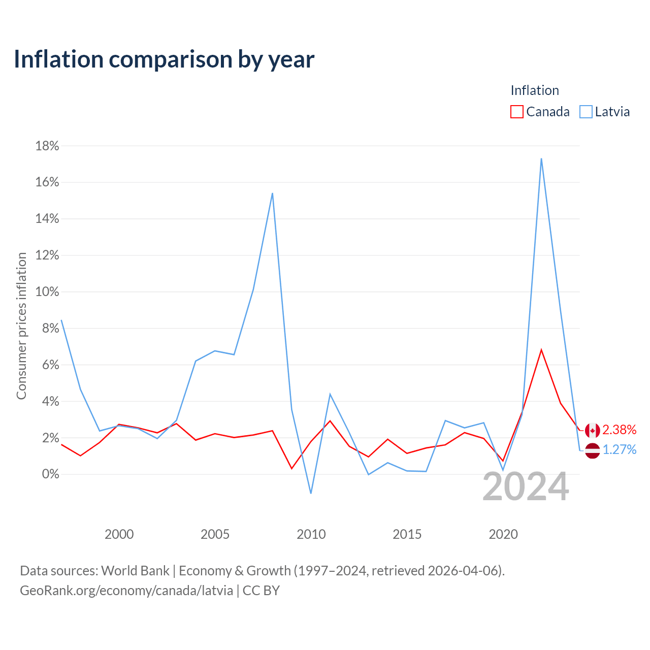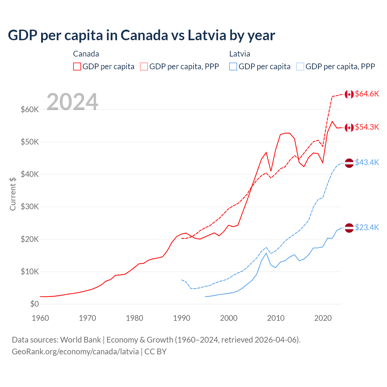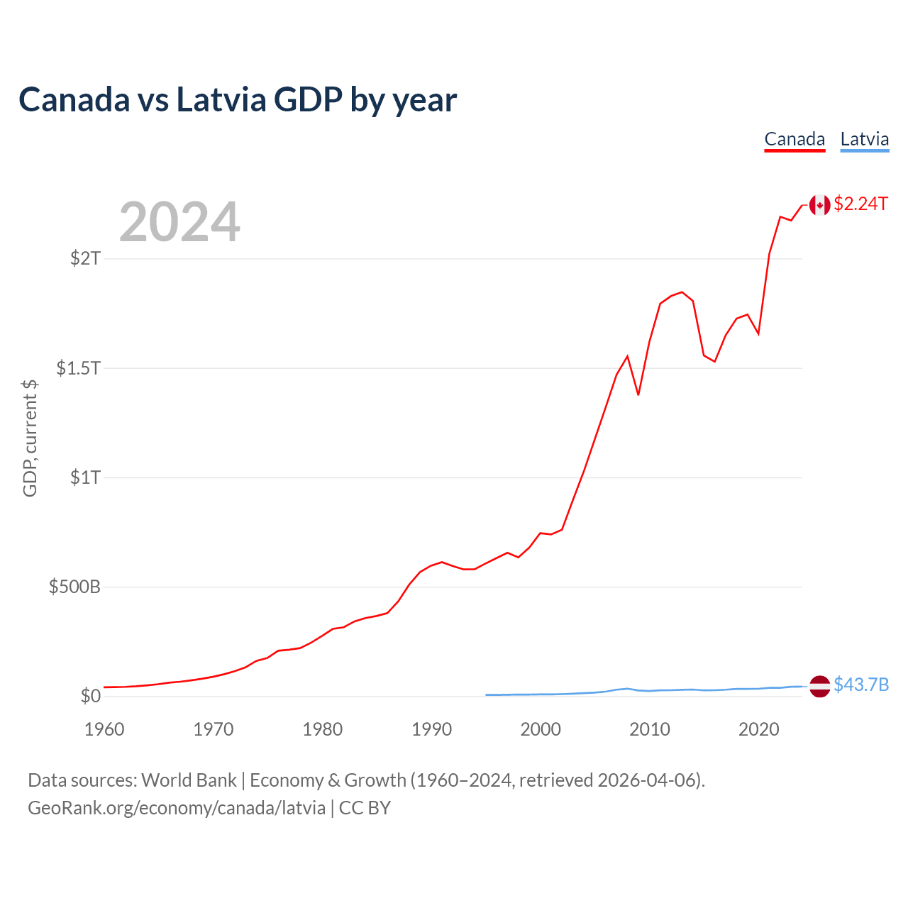 Canada has a GDP of $2.24T compared to $43.7B for Latvia, ranking 9/197 and 99/197 by economy size, respectively.