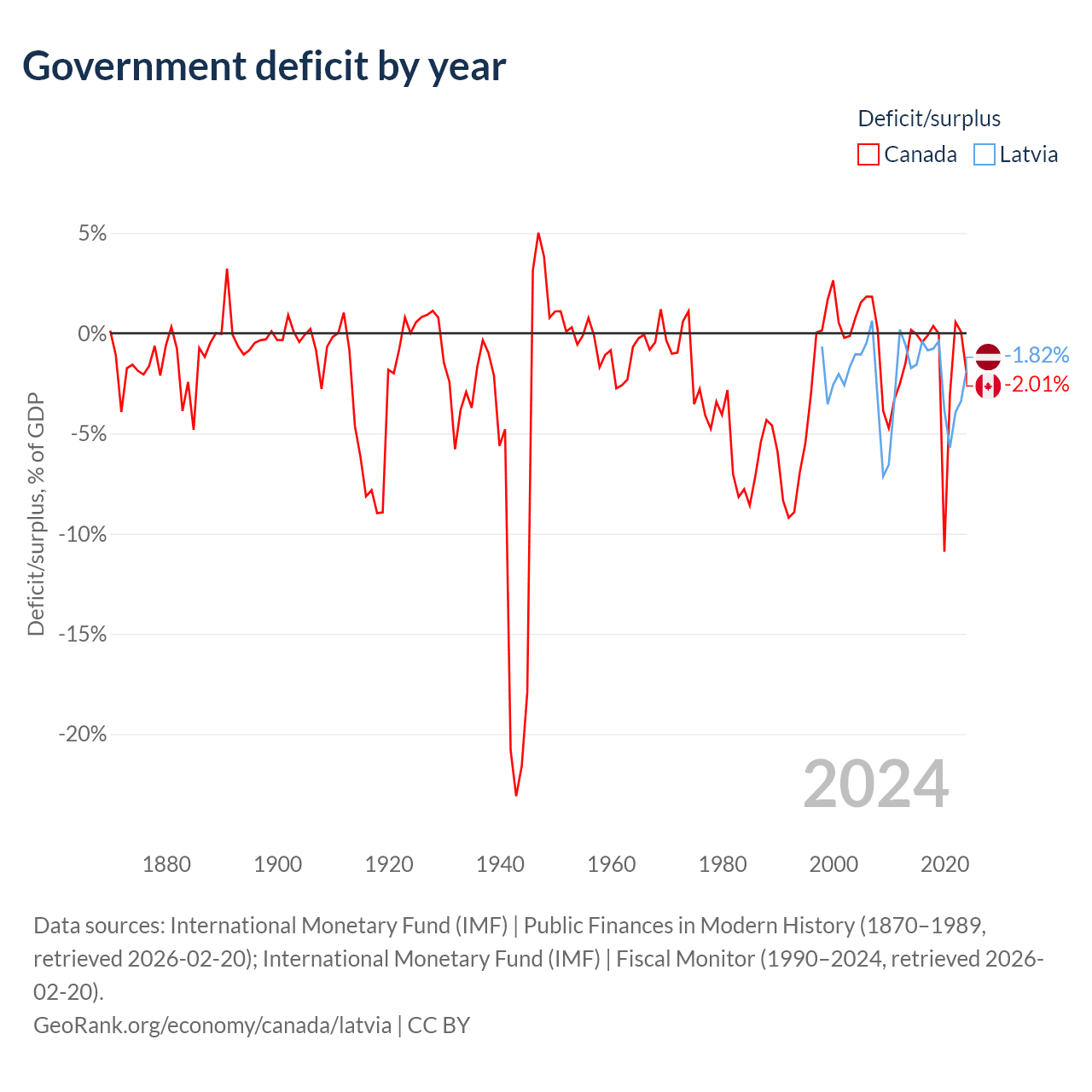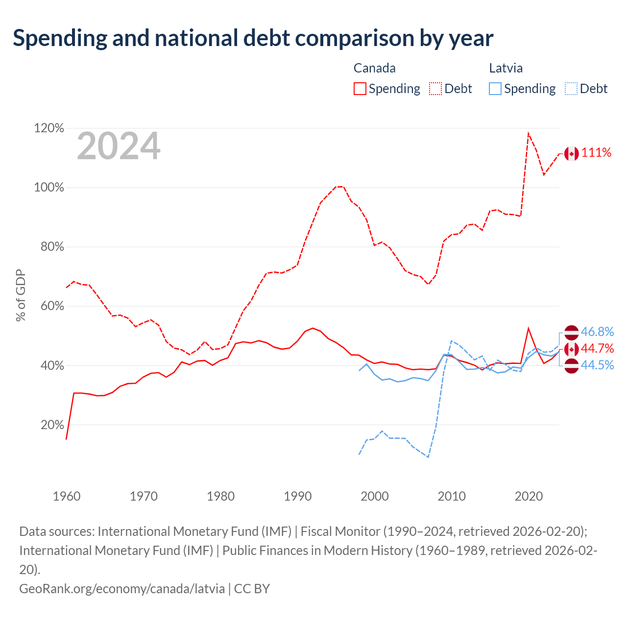 Canada has $2.5T in government debt (111.3% of GDP), compared to $20.4B (46.8% of GDP) in Latvia.