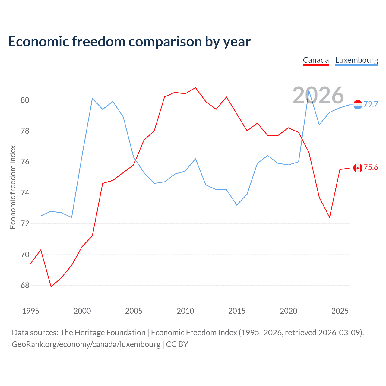 The Economic Freedom Index for Canada is 75.6, ranking 17/197, compared to 79.7 for Luxembourg, ranking 7/197. The chart above displays a comparison of annual changes in economic freedom indexes.