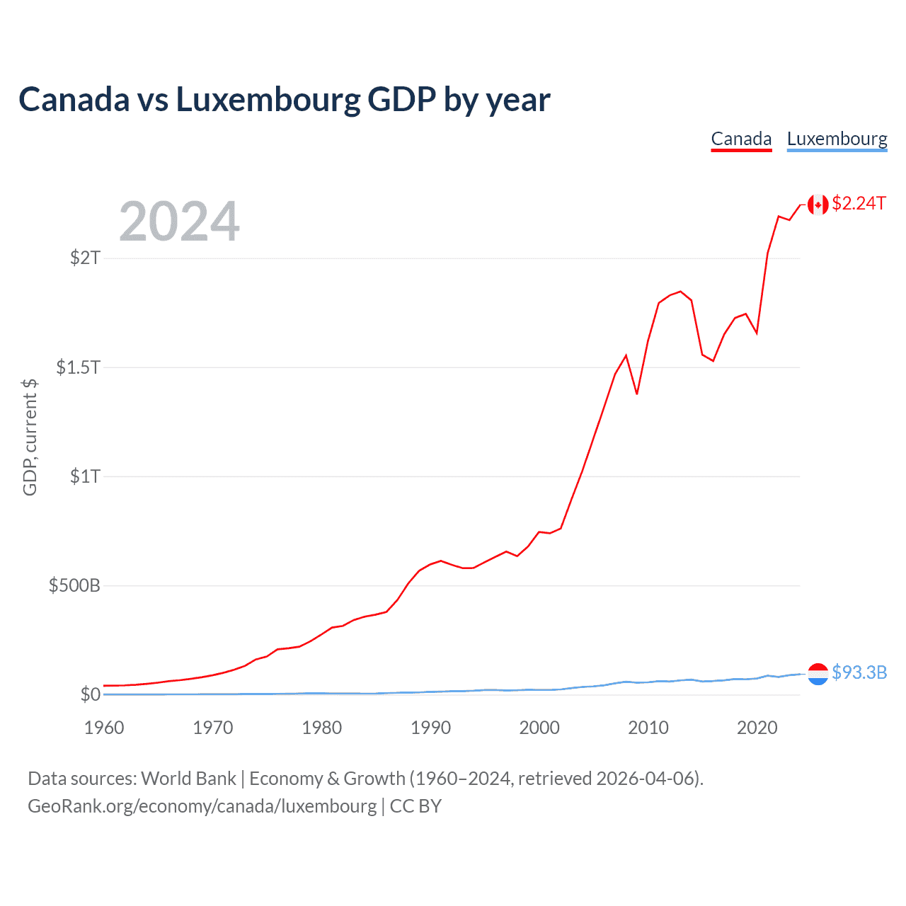 Canada has a GDP of $2.24T compared to $93.3B for Luxembourg, ranking 9/197 and 74/197 by economy size, respectively.