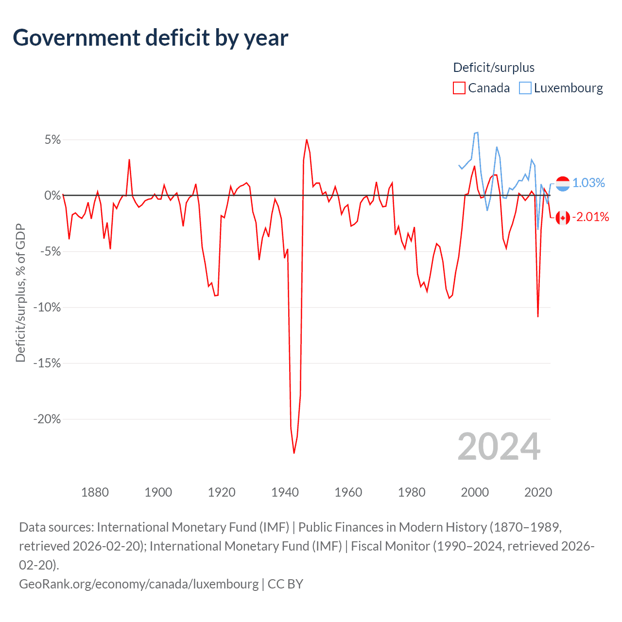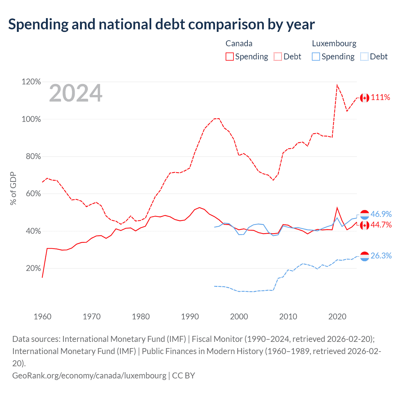 Canada has $2.5T in government debt (111.3% of GDP), compared to $24.5B (26.3% of GDP) in Luxembourg.
