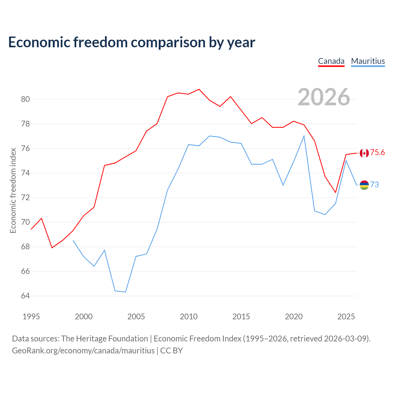 The Economic Freedom Index for Canada is 75.6, ranking 17/197, compared to 73 for Mauritius, ranking 26/197. The chart above displays a comparison of annual changes in economic freedom indexes.