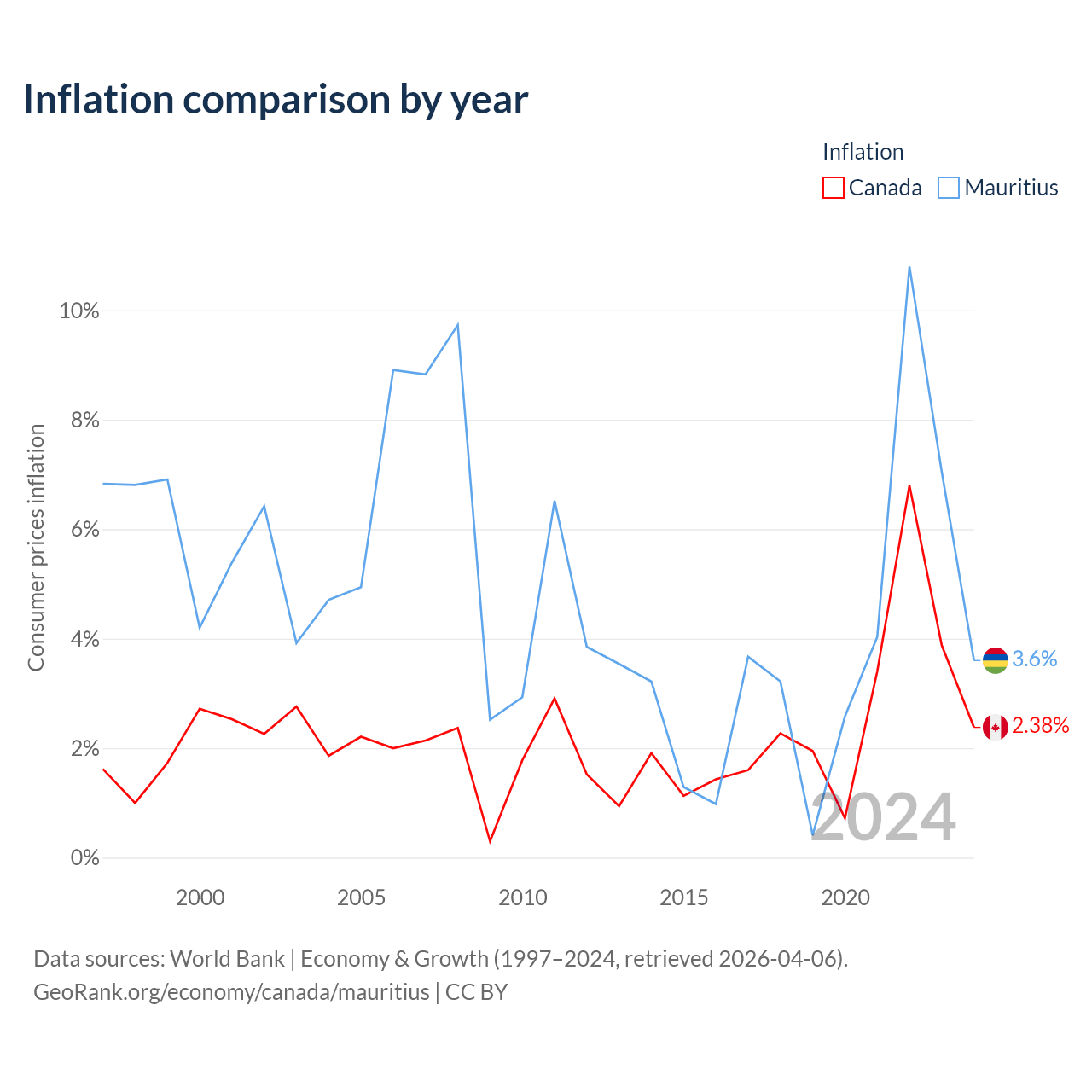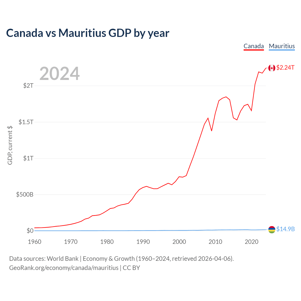 Canada has a GDP of $2.24T compared to $14.9B for Mauritius, ranking 9/197 and 143/197 by economy size, respectively.