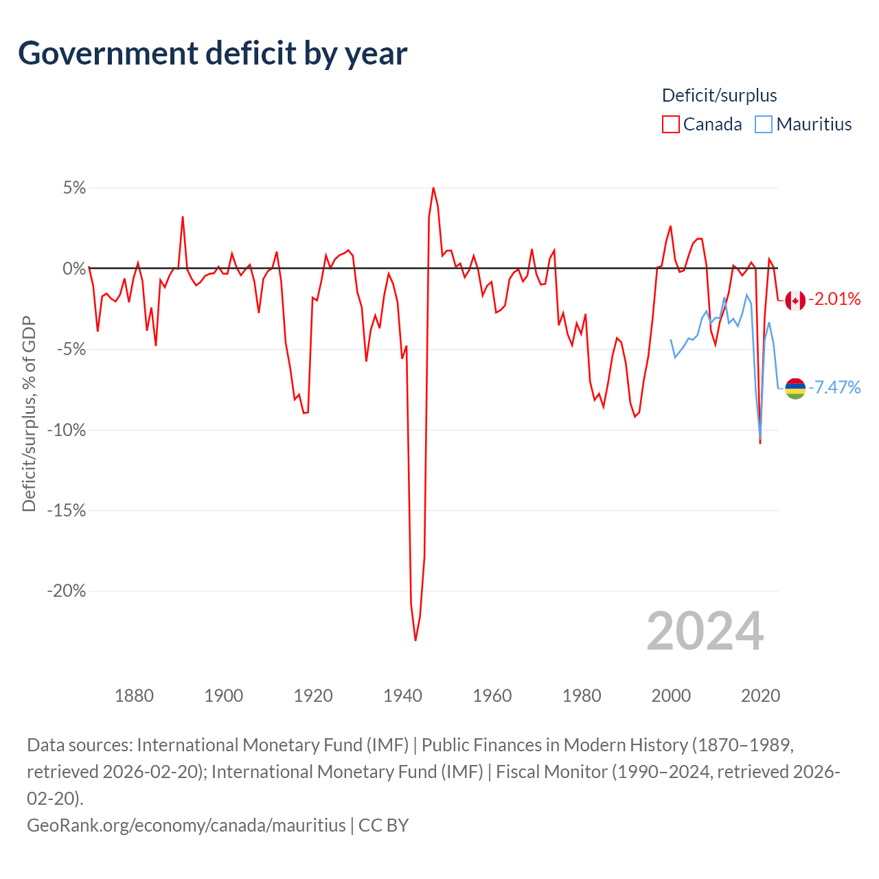 Canada has $2.5T in government debt (111.3% of GDP), compared to $13.6B (91.1% of GDP) in Mauritius.