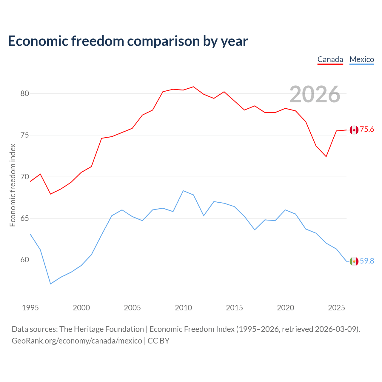 Data sources: The Heritage Foundation | Economic Freedom Index (1995–2026, retrieved 2026-03-09).