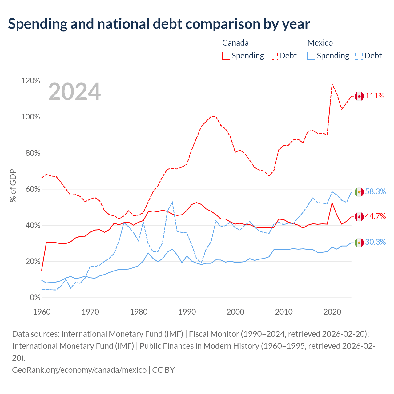 Canada has $2.5T in government debt (111.3% of GDP), compared to $1.08T (58.3% of GDP) in Mexico.