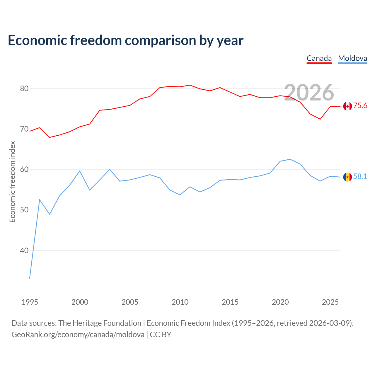 The Economic Freedom Index for Canada is 75.6, ranking 17/197, compared to 58.1 for Moldova, ranking 112/197. The chart above displays a comparison of annual changes in economic freedom indexes.