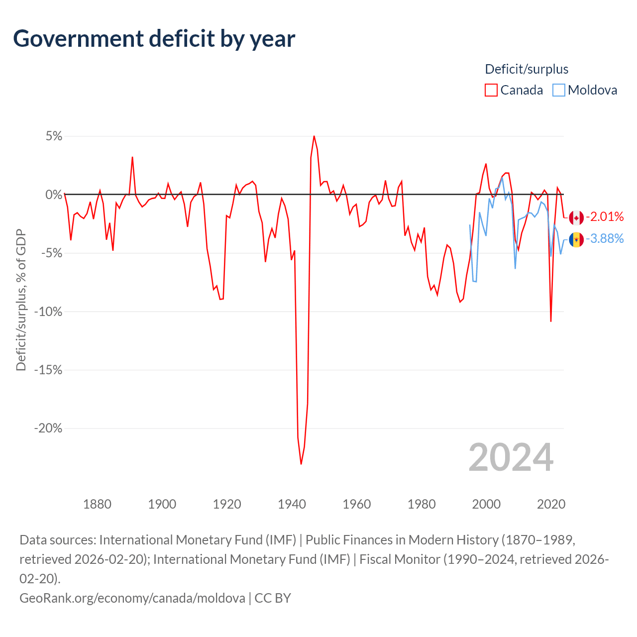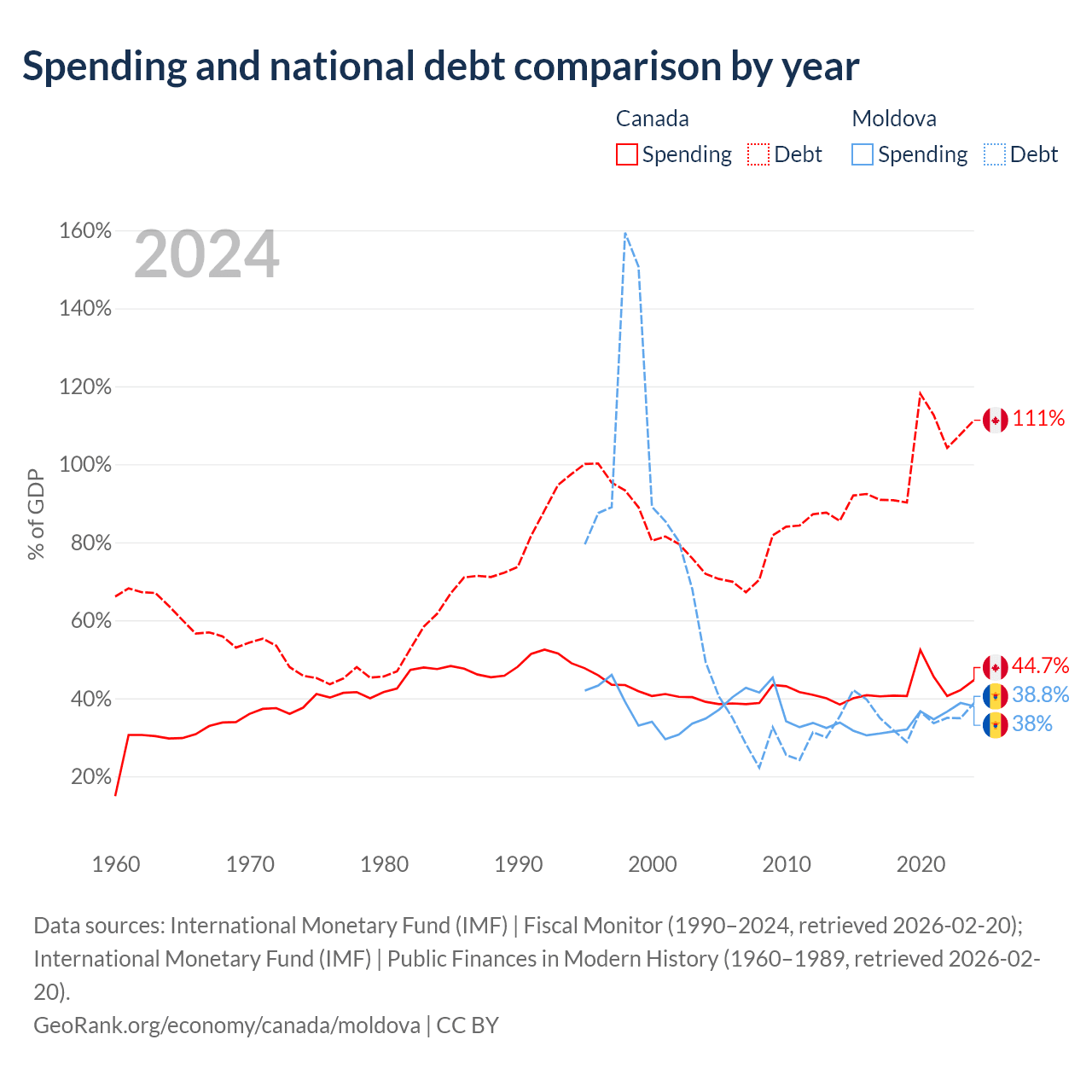 Canada has $2.5T in government debt (111.3% of GDP), compared to $7.06B (38.8% of GDP) in Moldova.