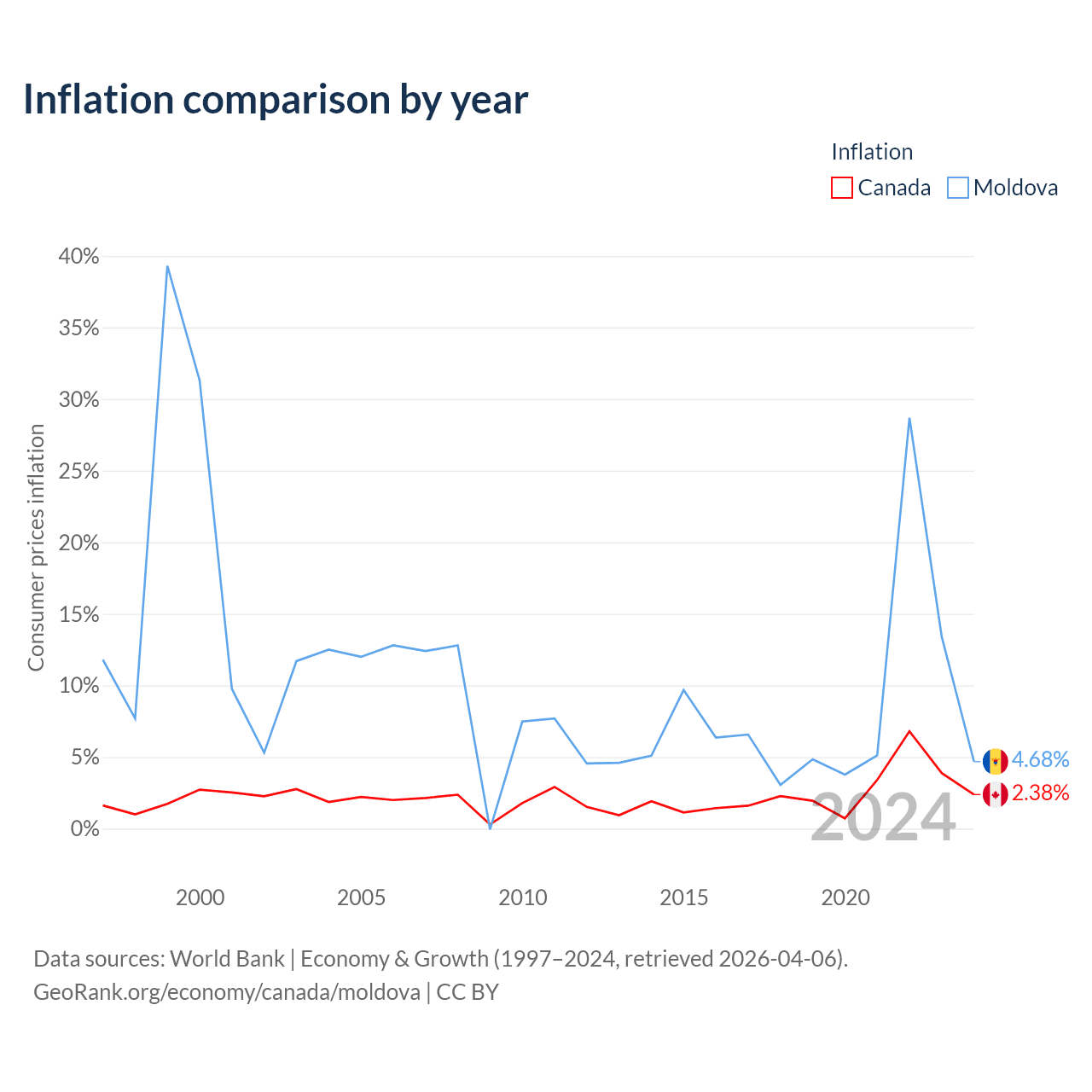 Canada has a GDP of $2.24T compared to $18.2B for Moldova, ranking 9/197 and 134/197 by economy size, respectively.