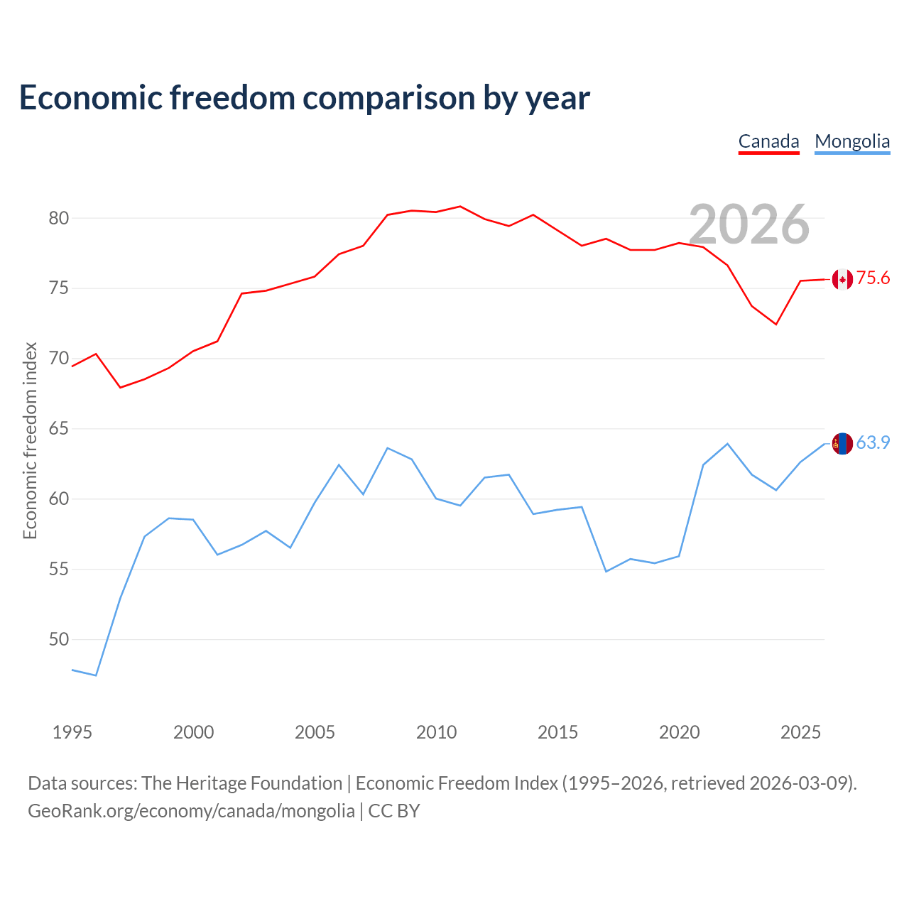 The Economic Freedom Index for Canada is 75.6, ranking 17/197, compared to 63.9 for Mongolia, ranking 76/197. The chart above displays a comparison of annual changes in economic freedom indexes.