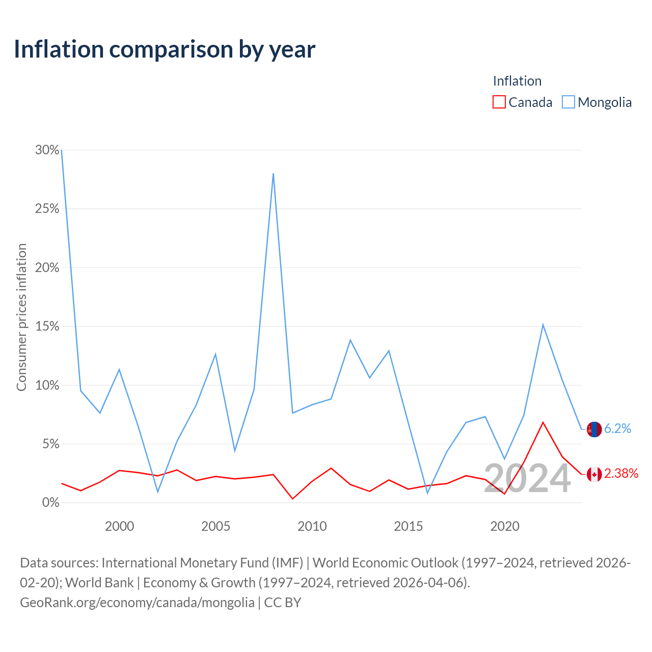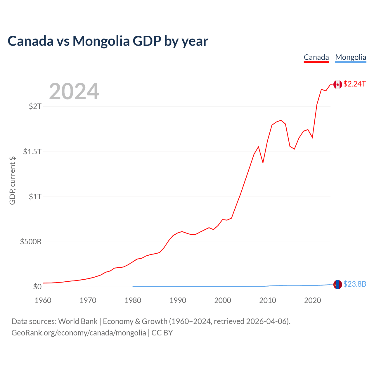 Canada has a GDP of $2.24T compared to $23.8B for Mongolia, ranking 9/197 and 121/197 by economy size, respectively.