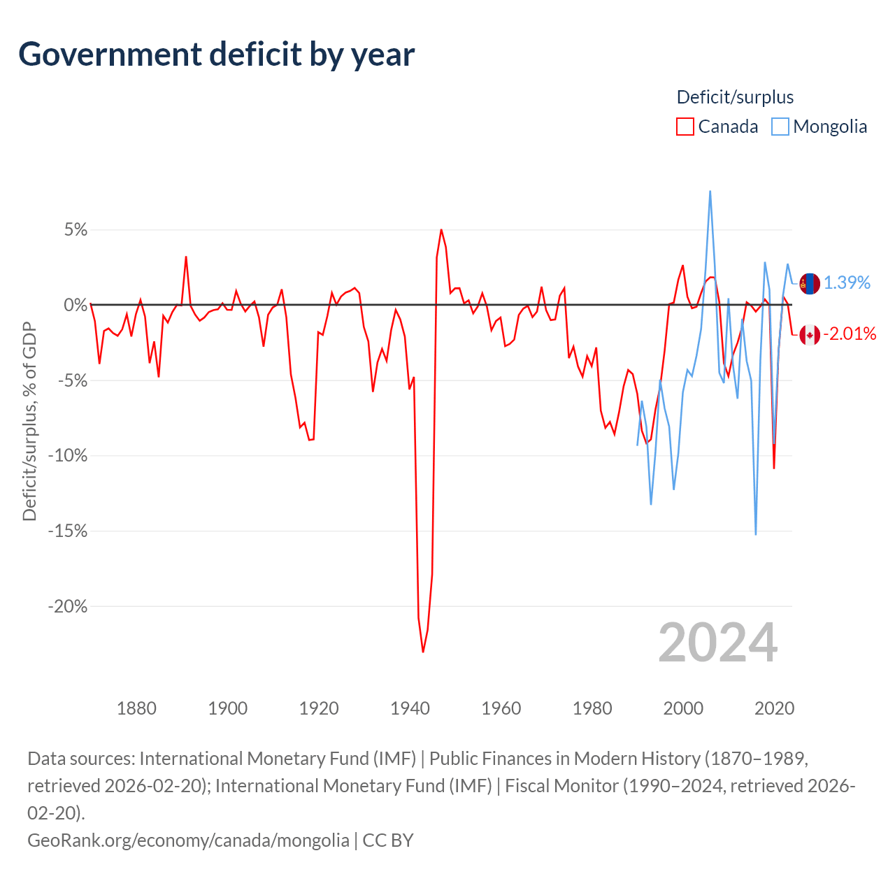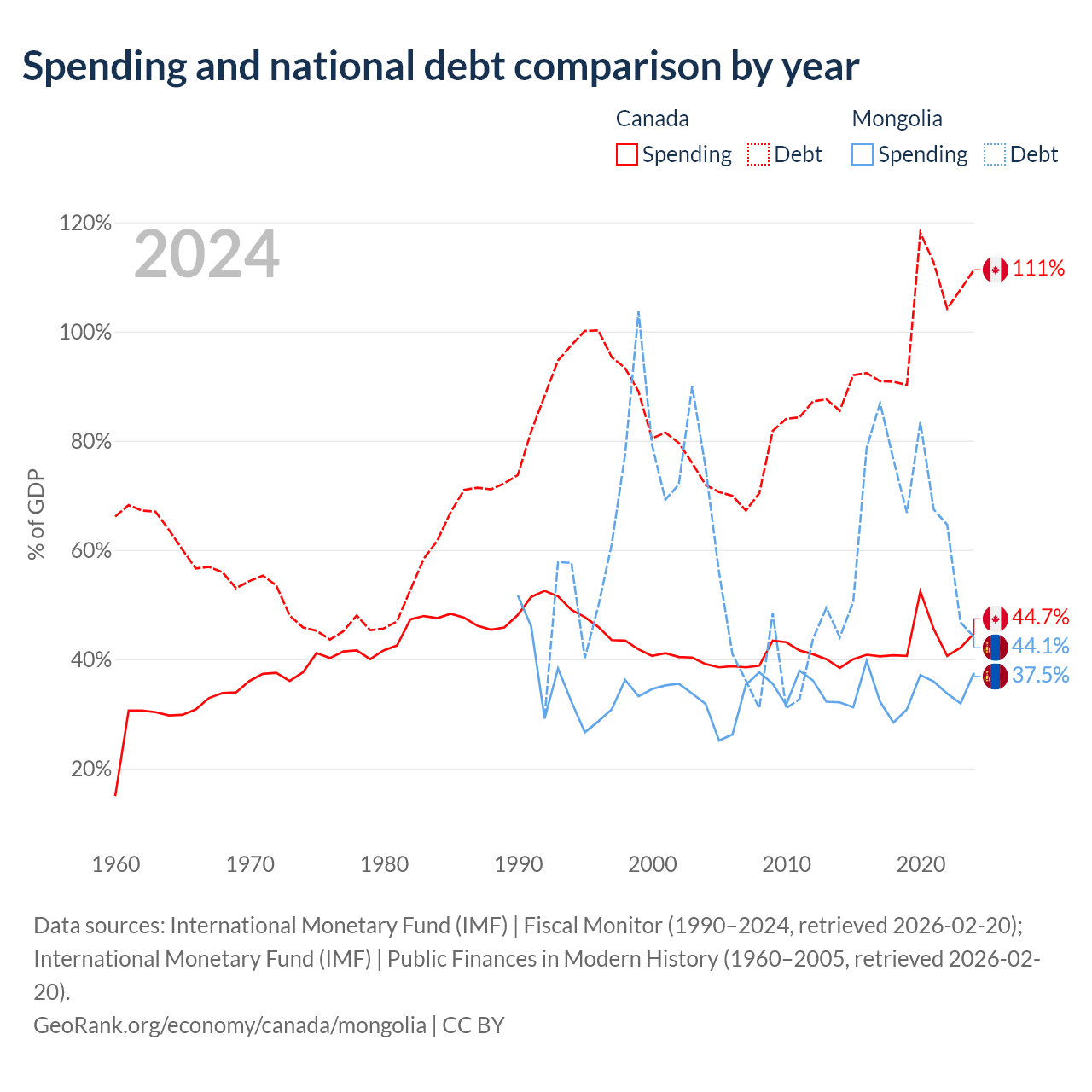 Canada has $2.5T in government debt (111.3% of GDP), compared to $10.5B (44.1% of GDP) in Mongolia.