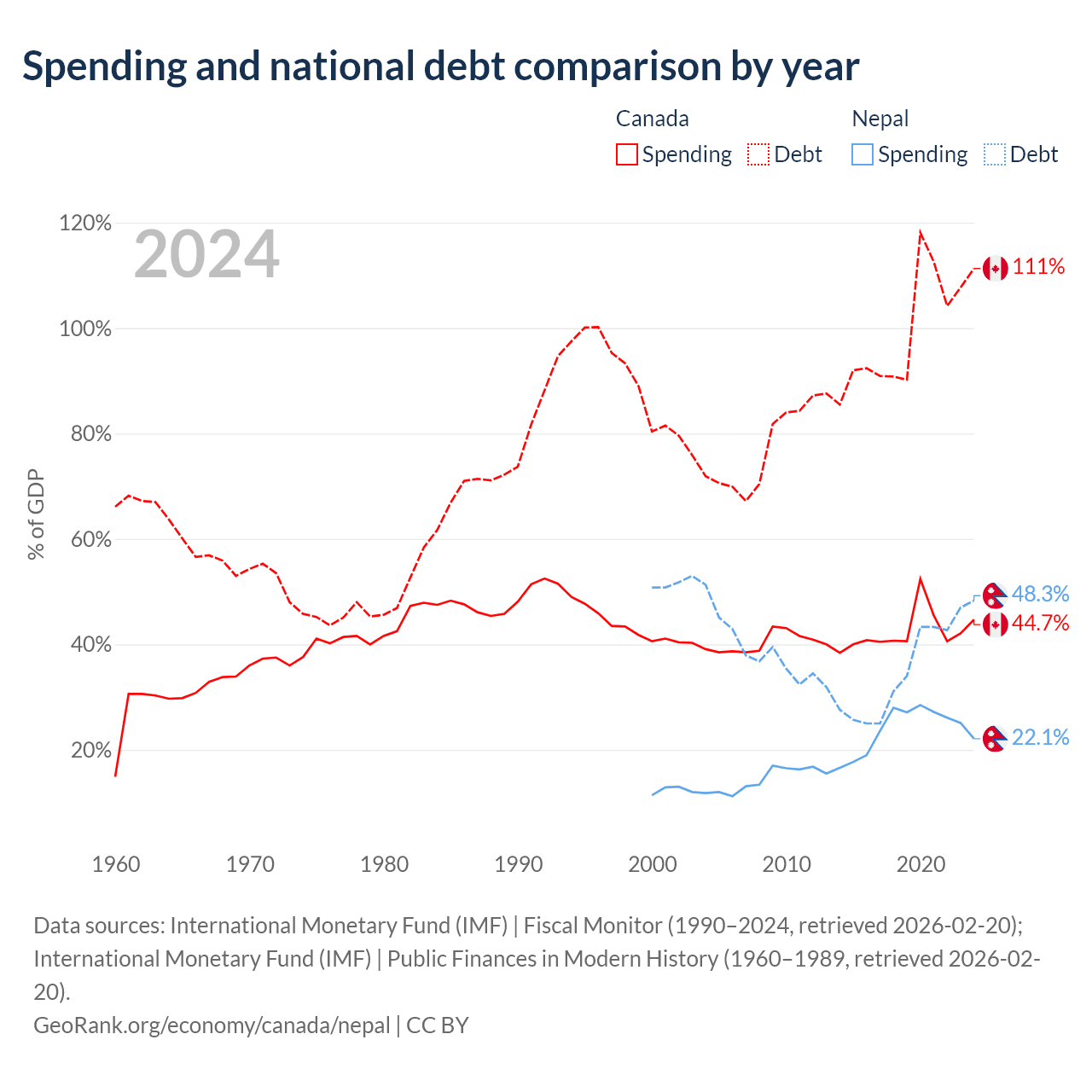 Canada has $2.5T in government debt (111.3% of GDP), compared to $20.7B (48.3% of GDP) in Nepal.
